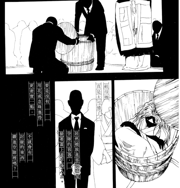 而说到兵卫的话,关口也想起前面兵卫的自白,兵卫在向警方自首前给京极堂他们说了自己的事。兵卫的妻子名为阿里,在生下儿子久保的隔年,兵卫父亲就去世了,阿里也在同一年变得有点古怪,整天郁郁寡欢。