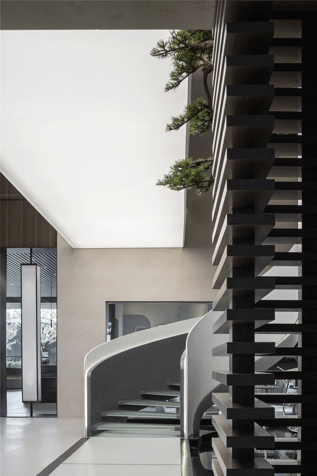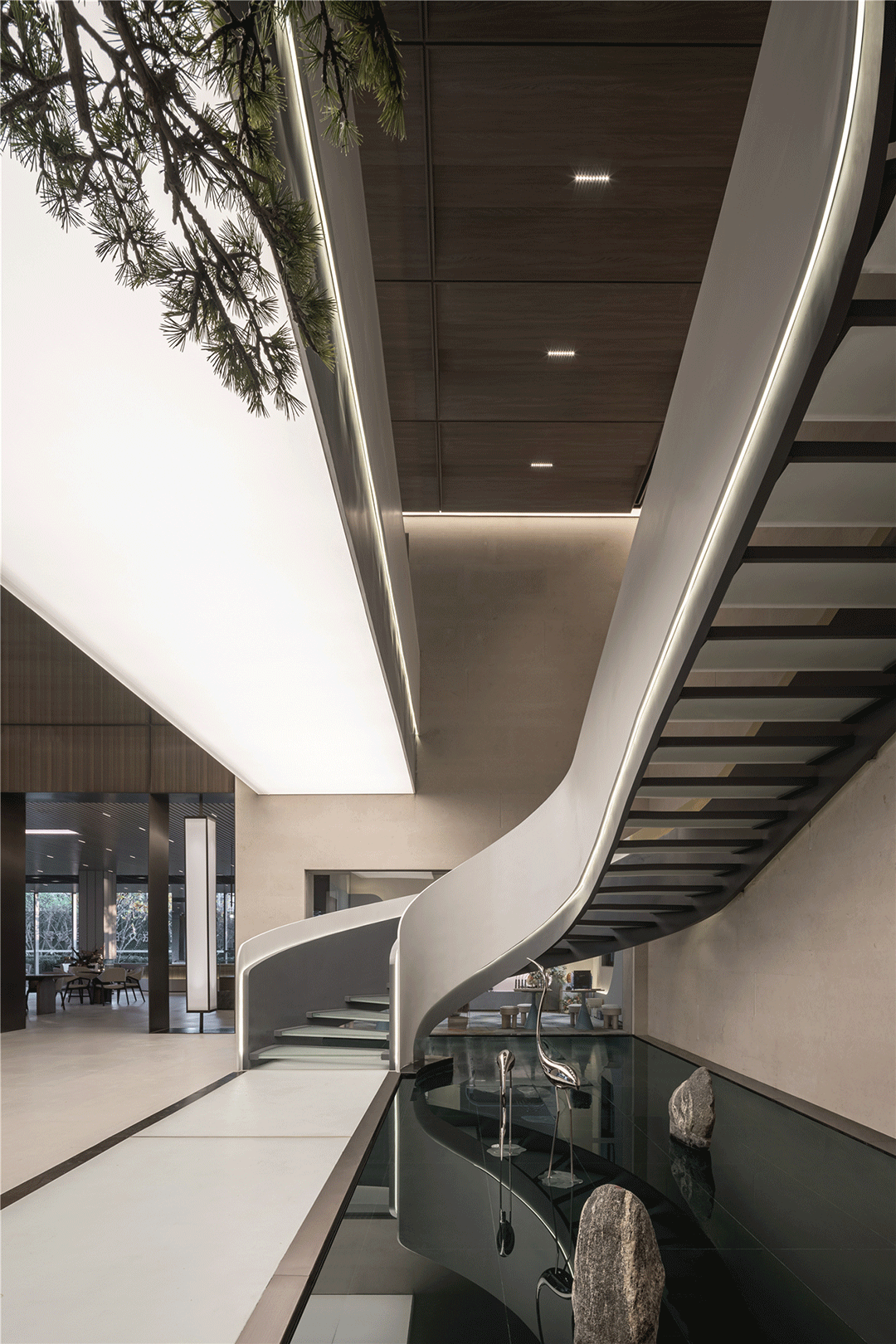 步梯下水景置石的设计强化了空间的诗性。山泉清洌,淙淙流泻于山石之上,天色已暝,却有皓月当空;群芳已谢,却有青松如盖。
