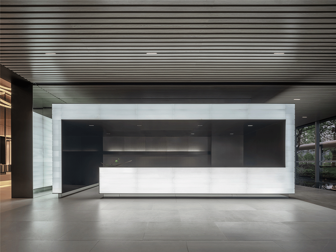 入口接待台由玉砂面亚克力板围合内藏LED灯带,让光芒轻轻地渗出,仿若漂浮在空间中的发光的盒子,打造空间的艺术装置,趣味性和艺术性的植入增加视觉效果,触发探索的欲望。