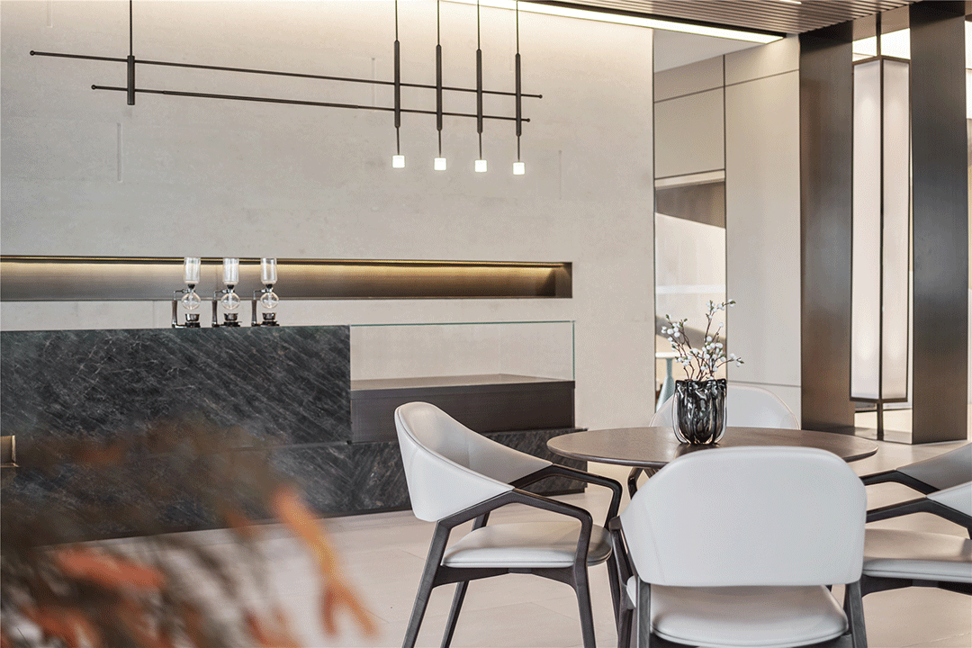 洽谈区以书吧、水吧为主题情境的功能空间,木纹格栅为基调,金属质感的通透,大理石的精致细腻,氛围灯光的柔和光影,空间在纯净静谧中撩动心绪。