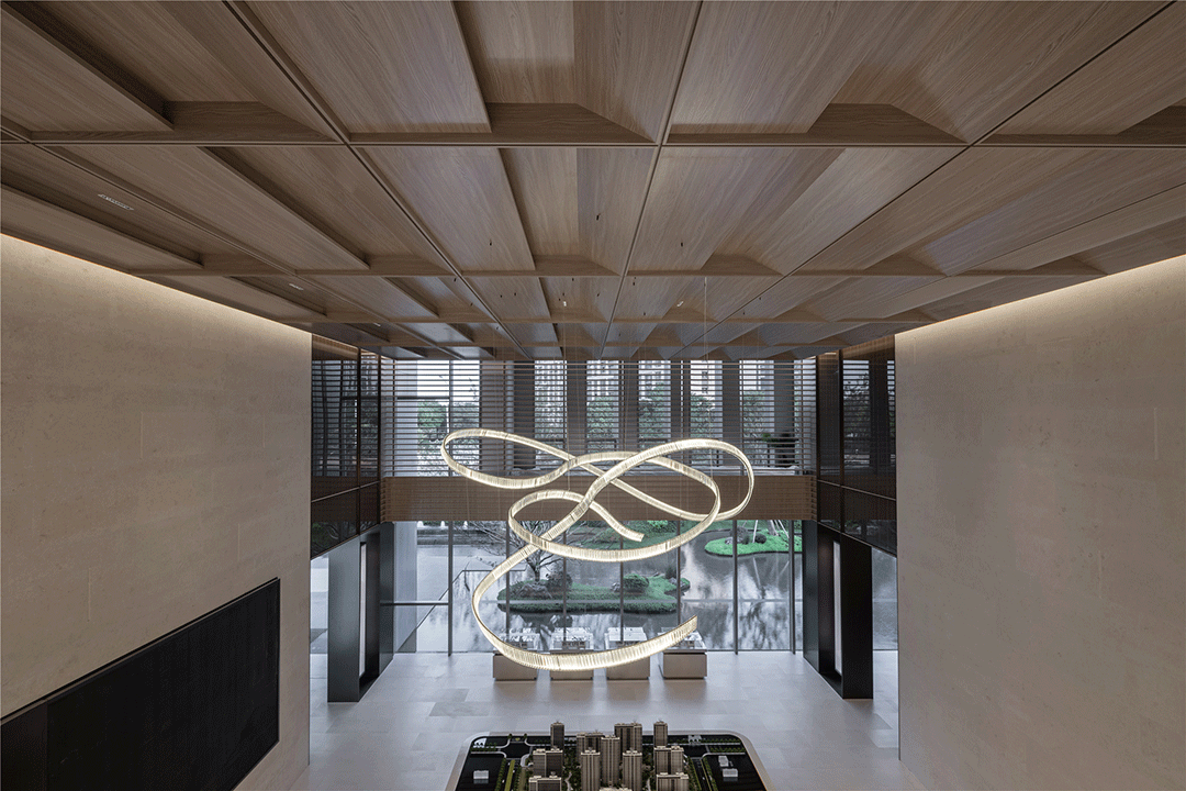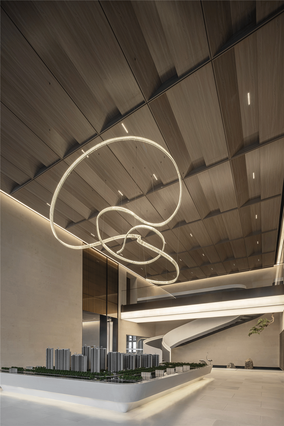 水波微漾,寻着涟漪散开来的轨迹、结合灯光效果,将自然界的美景运用于沙盘灯装置,结合天花造型所产生的光影效果使整个空间更加灵动。室内外自然融合一体、温柔诉说生命的变化。
