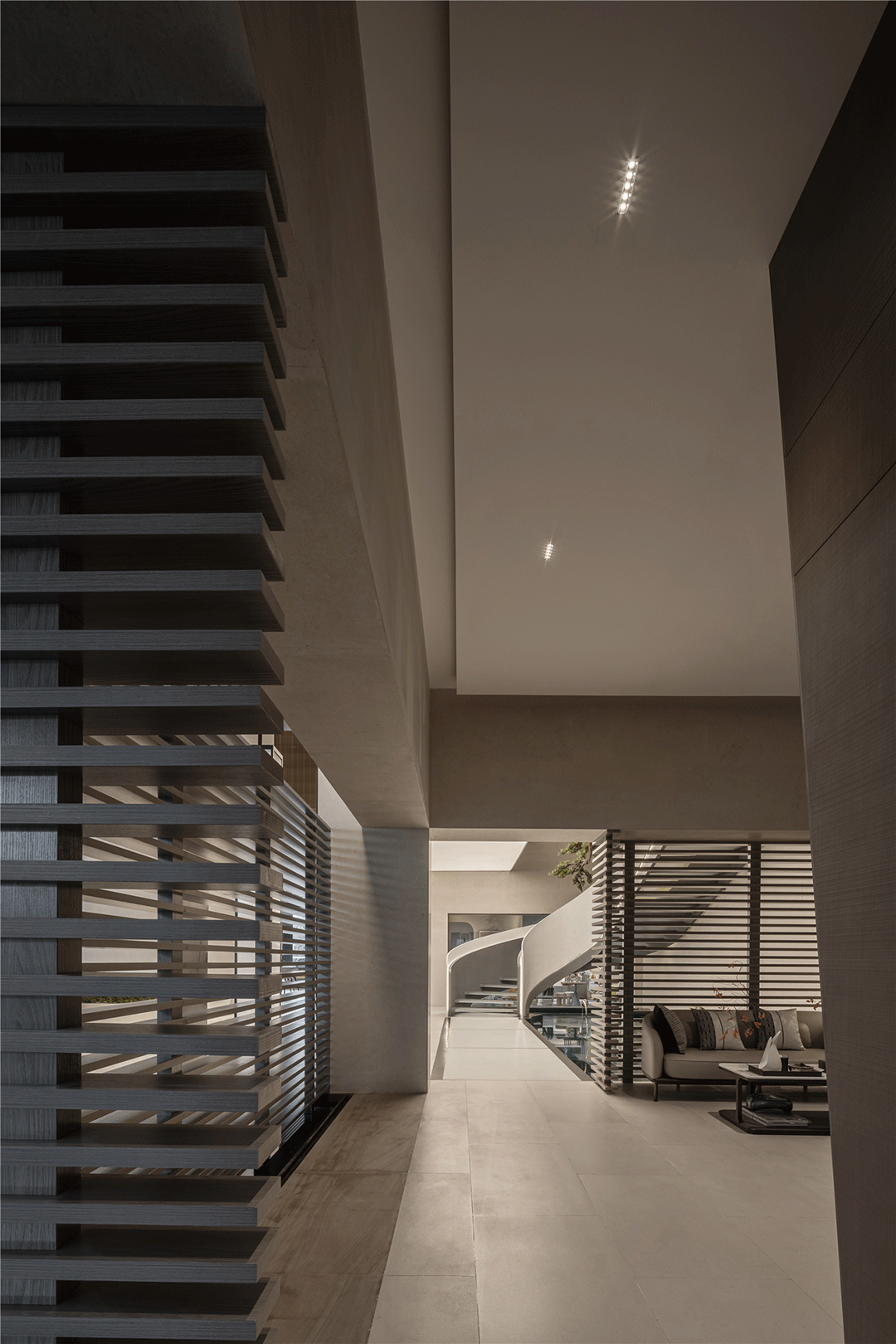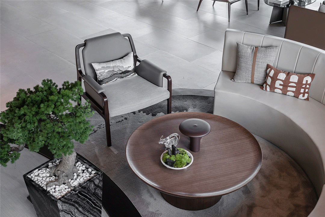 弧形沙发区为疏落的空间增添趣味性和节奏感,其夹丝玻璃围边宛若水中波纹,诠释漂浮的体验感。