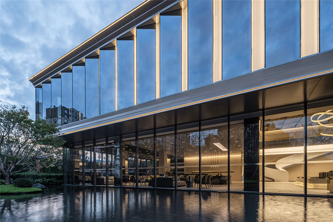 玻璃幕墙萃取大自然的律动,映出水波摇曳、树影婆娑的姿态,人们穿行于其中,演化成落地窗的艺术装置,错落的自然光线镌刻场域时光的痕迹。与自然的互动吸引着往来人的目光,营造“看与被看”的视觉焦点,邀请人们来此探索和互动。