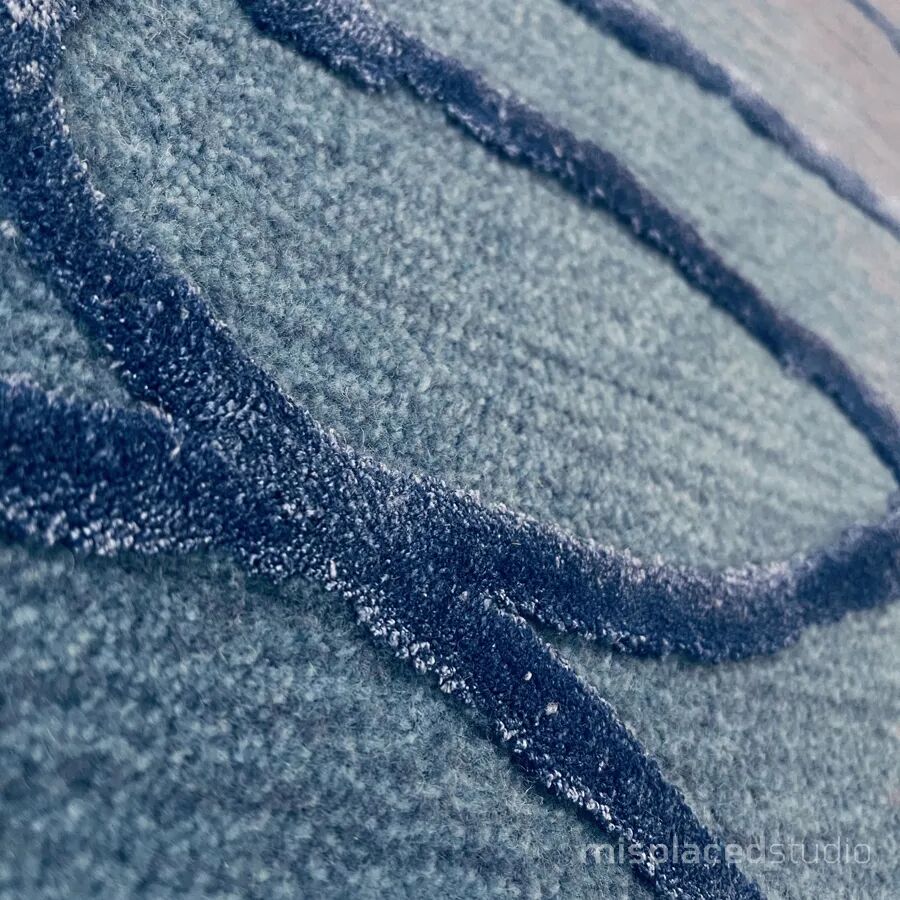 目前在misplaced studio材质搭配上,较常出现的是进口新西兰羊毛搭配可持续性材质竹纤维丝,竹纤维丝的光泽感较强,很适合用在地毯图形的点缀部分,会让地毯增添立体感。