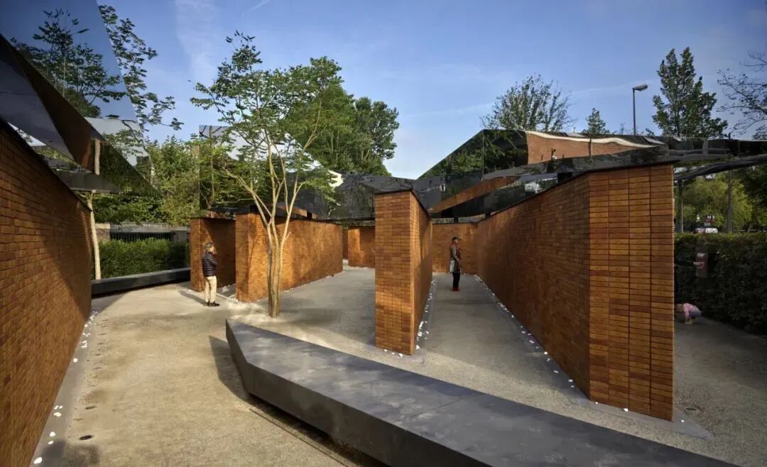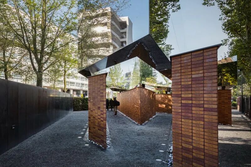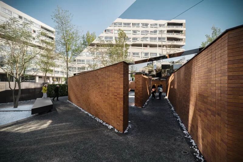 游客进入纪念碑,会看到由两米高的砖墙连成的通道,上面附有纪念信息。四个体量均由镜面不锈钢制作而成,堆叠于砖墙之上。10.2万块砖块被刻上遇难者的姓名、年龄和生日。此外,还留有1000块空白的砖块,以纪念未留下姓名的遇难者。