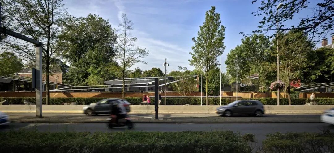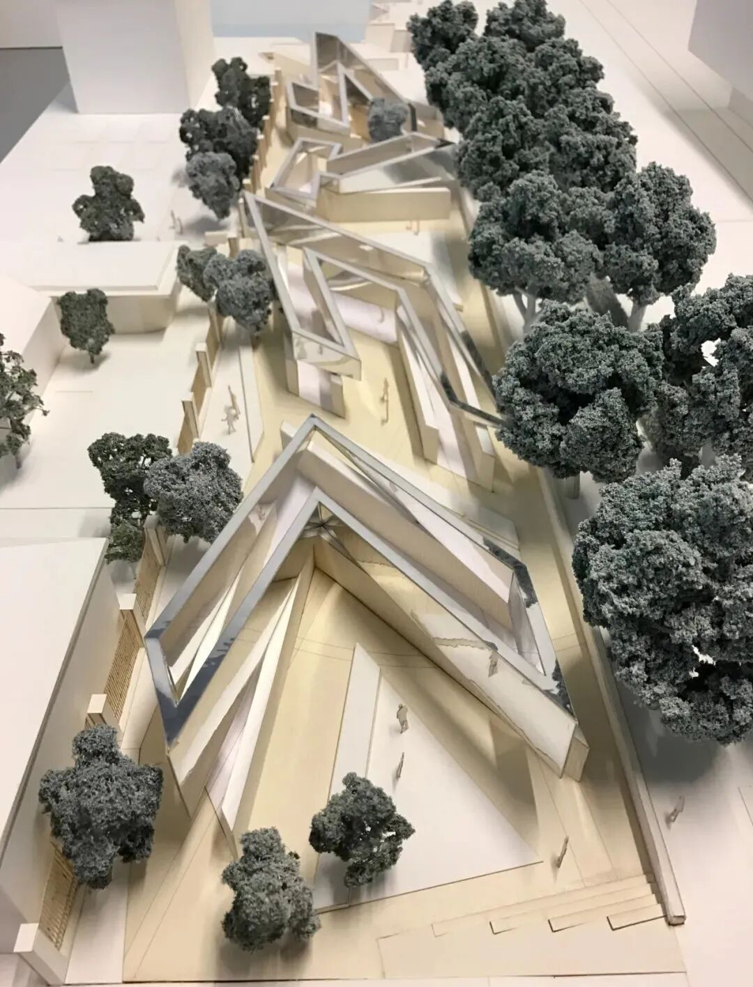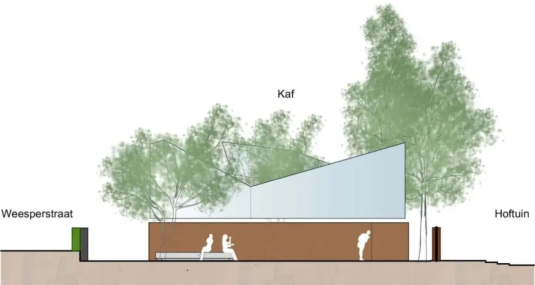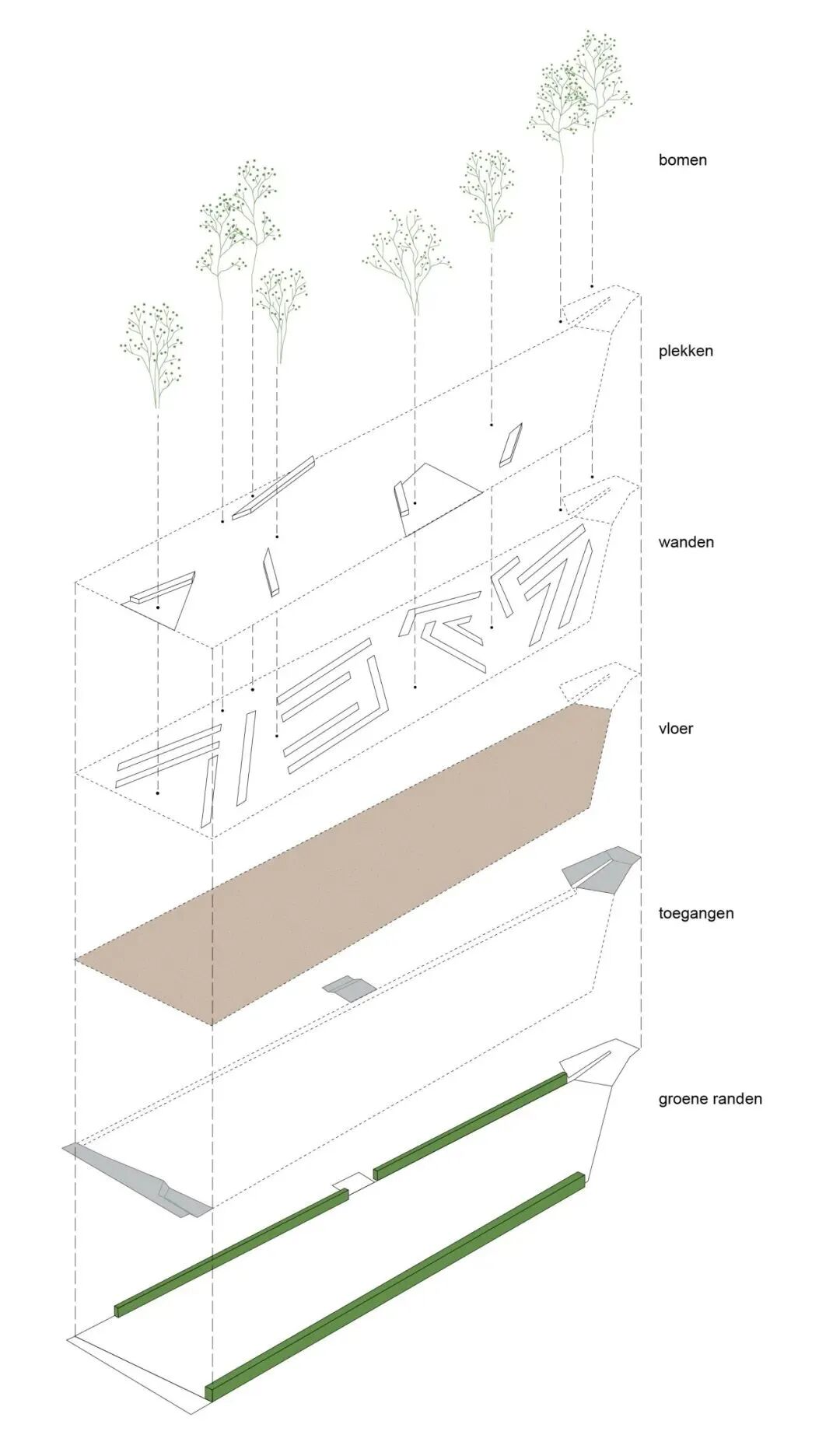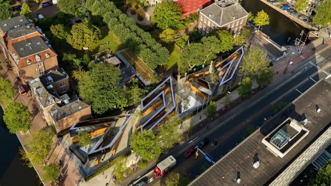 1700平方米的纪念碑由四个体块组成,形体对应希伯来语单词“לזכר”(纪念)。这些体块沿主干道Weesperstraat南北方向呈直线排列,西侧是Hoftuin展馆。