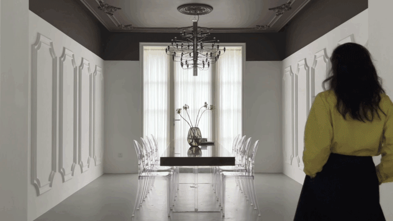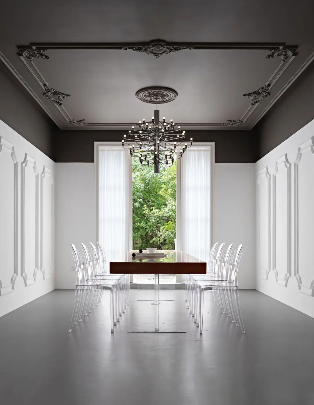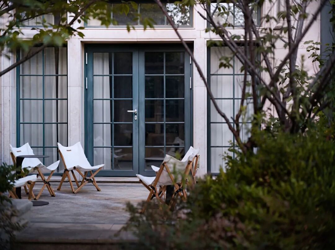 简约的庭室中央,透明餐椅与桌腿形如悬浮在空中,背后一扇可供自由行走的单门链接内外,建筑的严正与自然的柔和开启不同次元的对话。超现实主义手法让空间走进新维度。