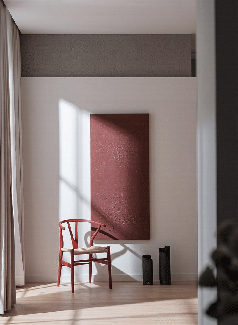 餐后休憩客区以温馨的木地板为主,冬暖夏凉,柔软的红酒色丝绒沙发与同色系漆画、圈椅镌写沉静诗意,按黄金比例分割的灰白墙面串联起所有的生活场景。