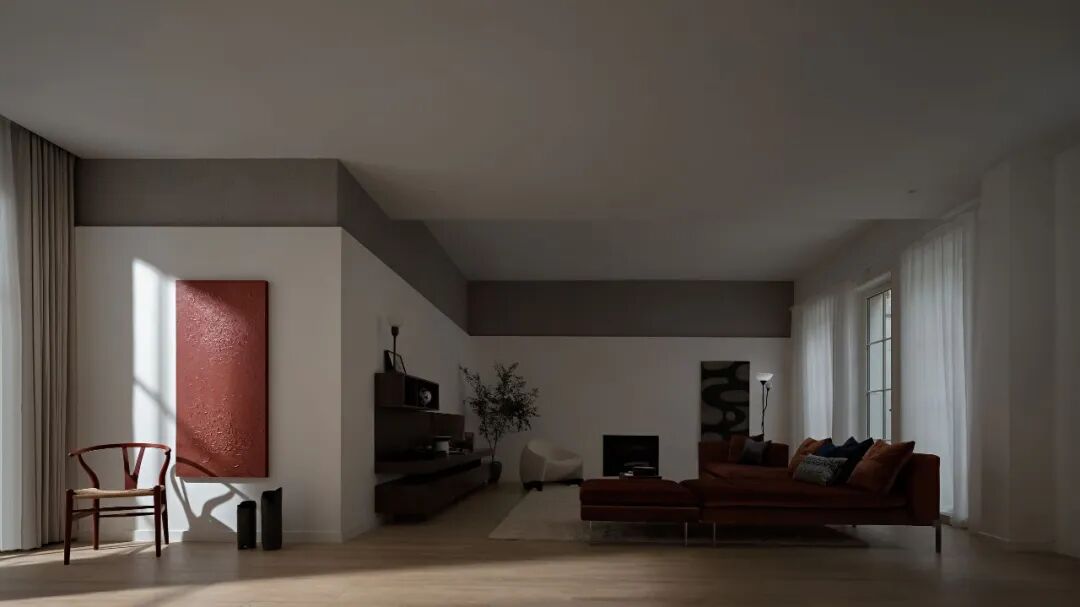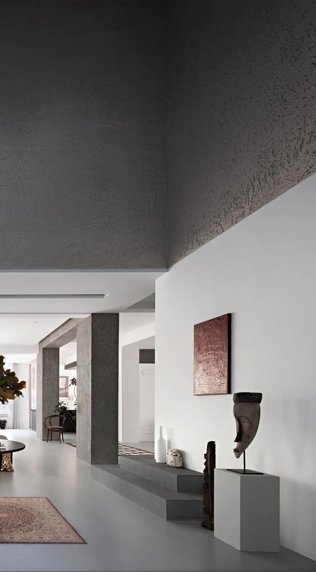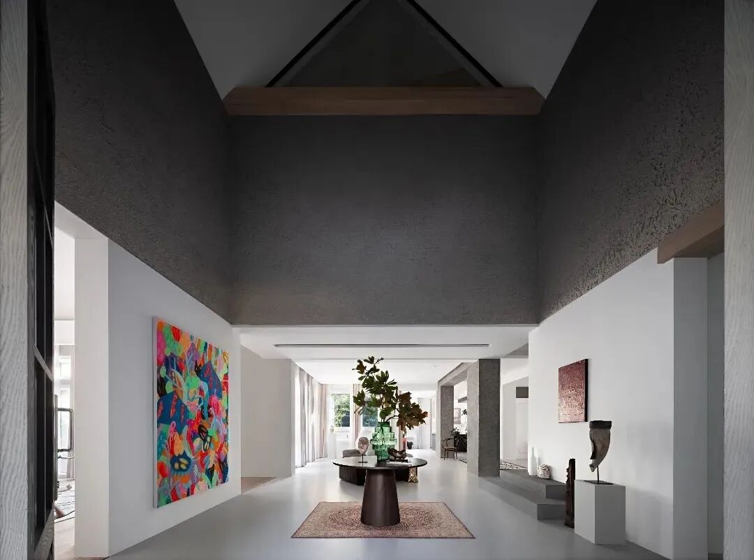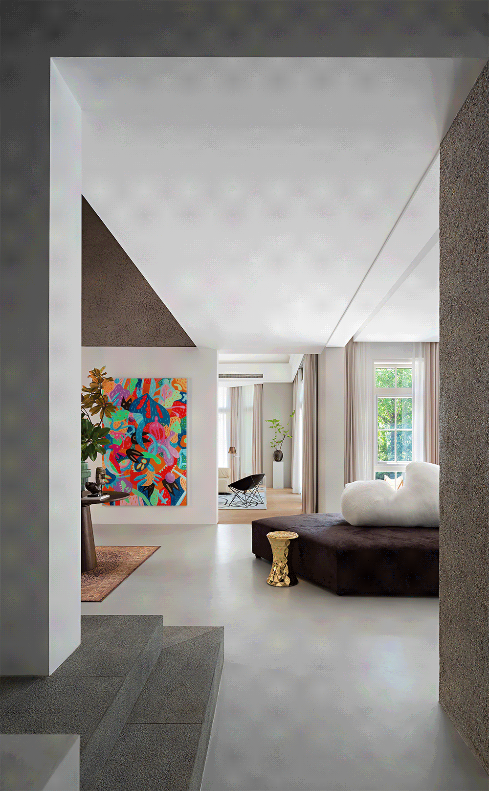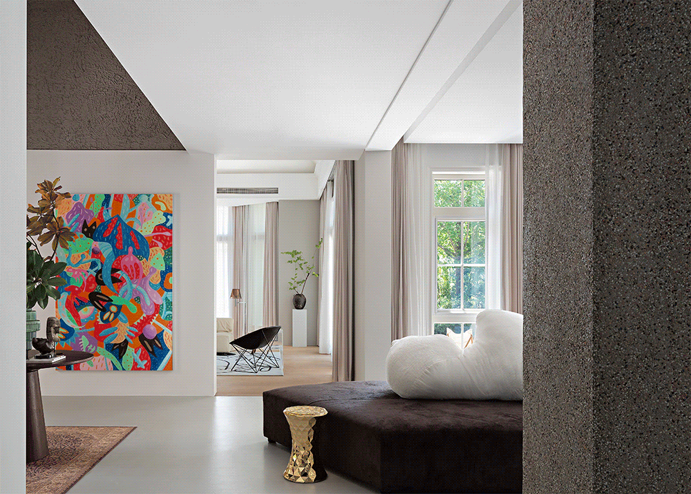 冲突之中,下层白色平滑饰面如画廊般精致,上层暖灰色的拉毛肌理则凸显出艺术质感。