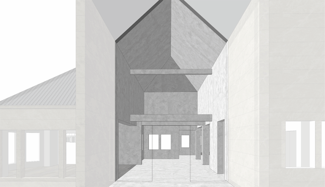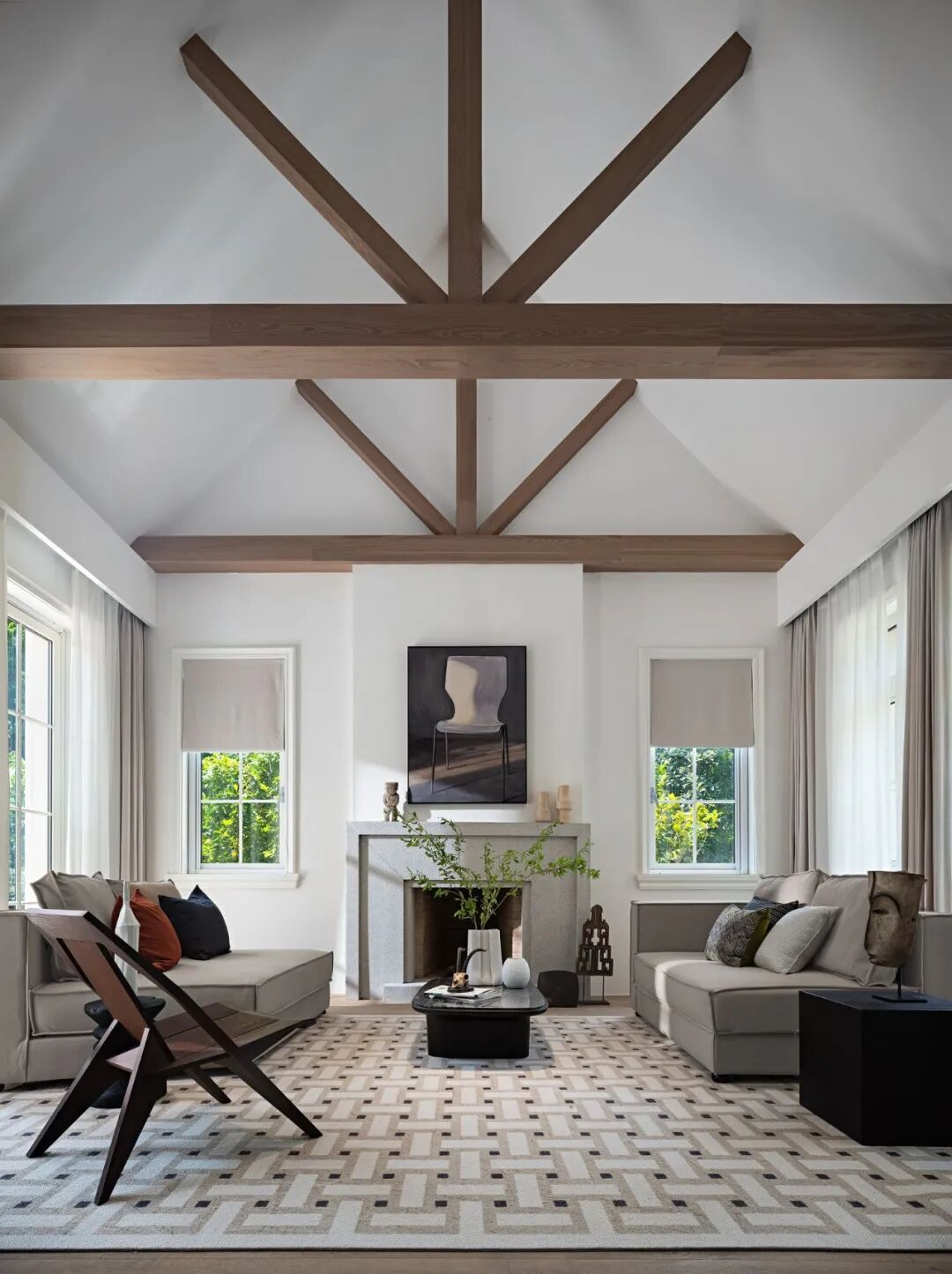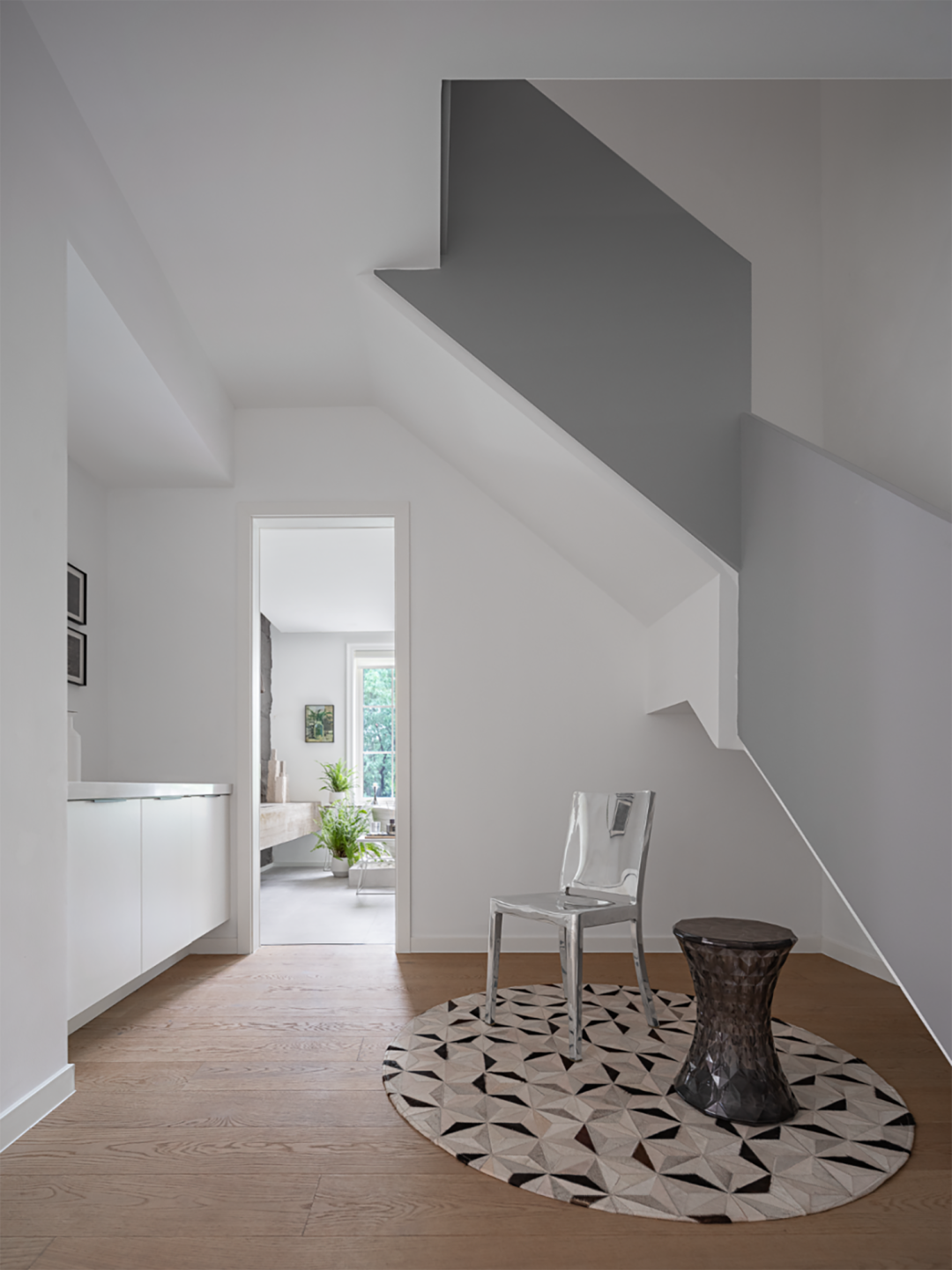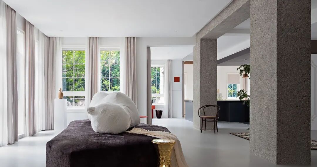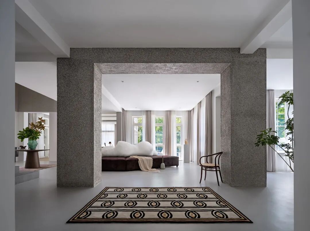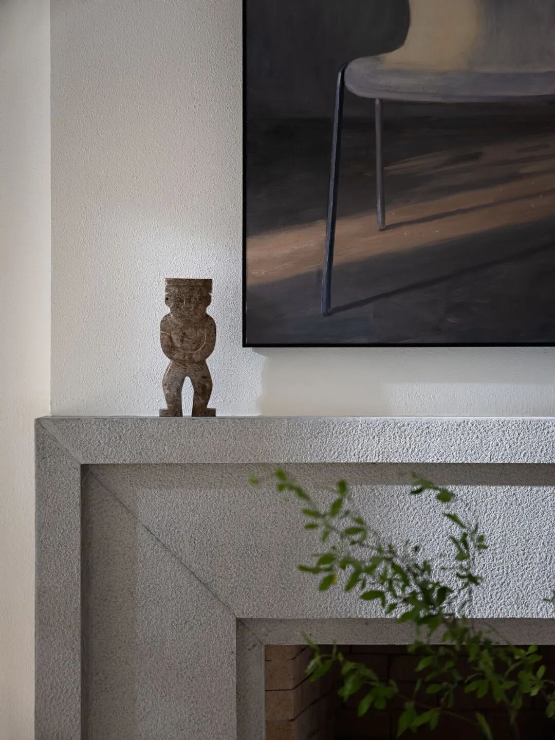 冲突之中,下层白色平滑饰面如画廊般精致,上层暖灰色的拉毛肌理则凸显出艺术质感。