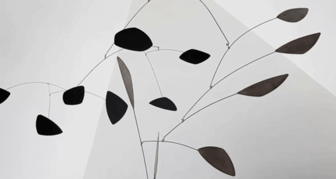 在抽象画作的引导下,由窄墙隔断的侧厅拥有超高斜坡白顶,四周浅灰墙面上有细微的肌理。空调侧风口不远处悬挂的考尔德动态平衡雕塑,以自身的灵动反衬空间的宁静。