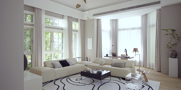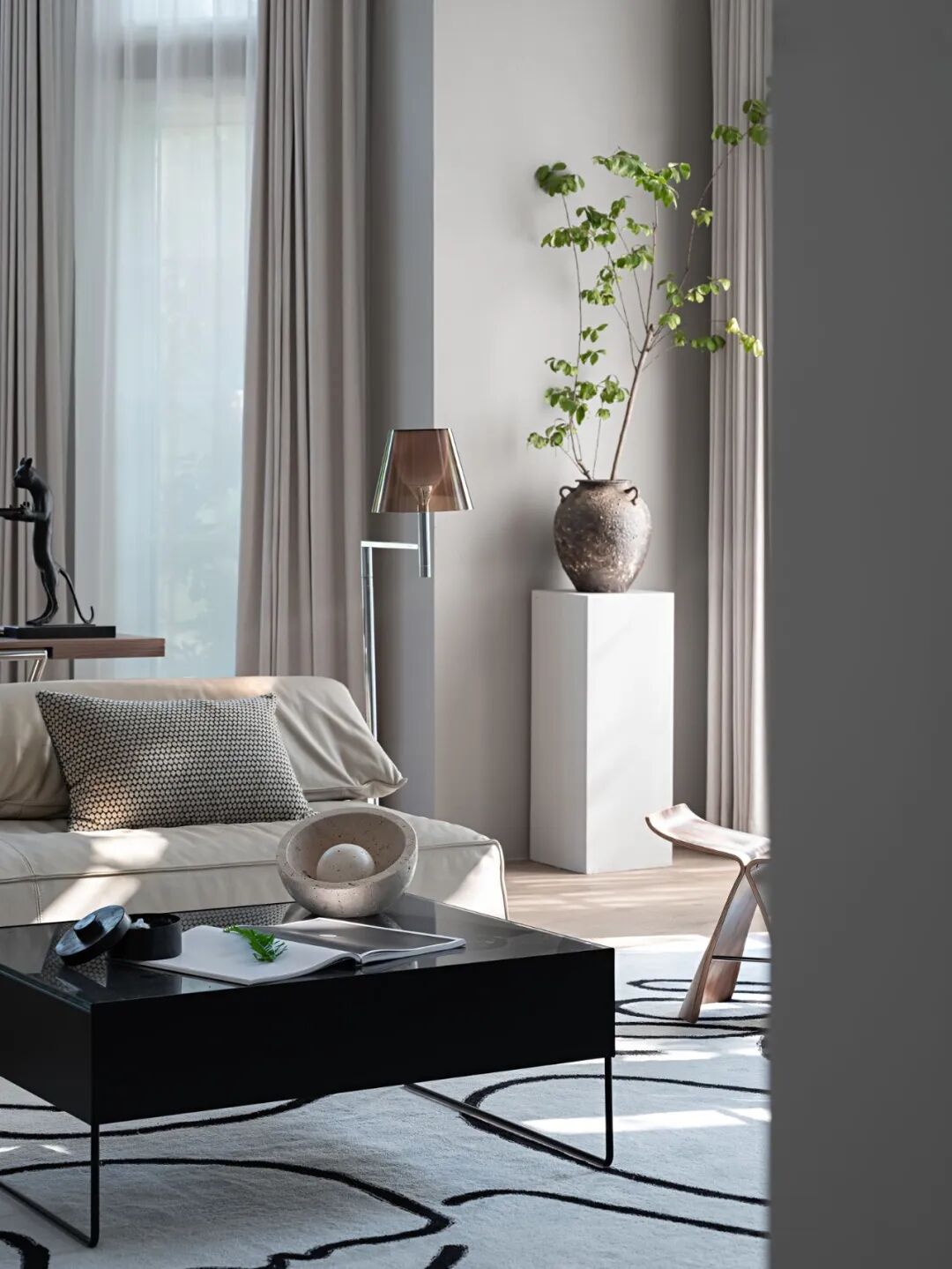 前厅是首层的视觉中心,也是家庭生活的核心,通向侧厅、廊厅、西厨与次客厅。东向与南向落地窗赋予这里充足、舒适的自然光,黑色不规则沙发上的白色巨熊慵懒超然。