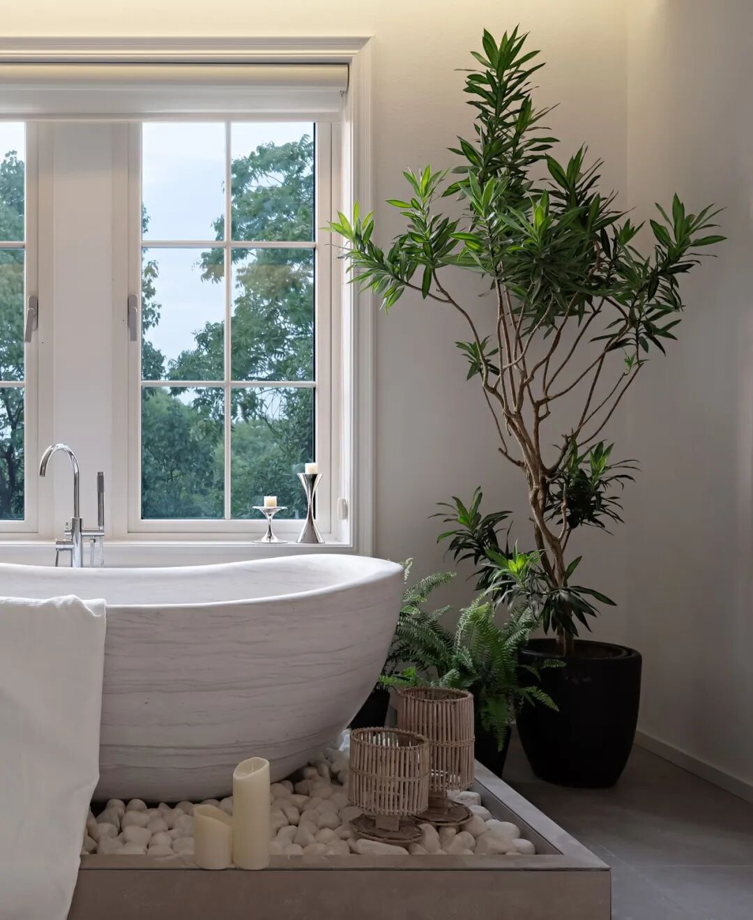 二层主卧采用了细纹白色乳胶漆墙面与木地板,丰富柔和、明亮舒适。主卫窗前的独立浴缸极尽浪漫,在自然石材与绿色植物的衬托下仿佛露天浴场。