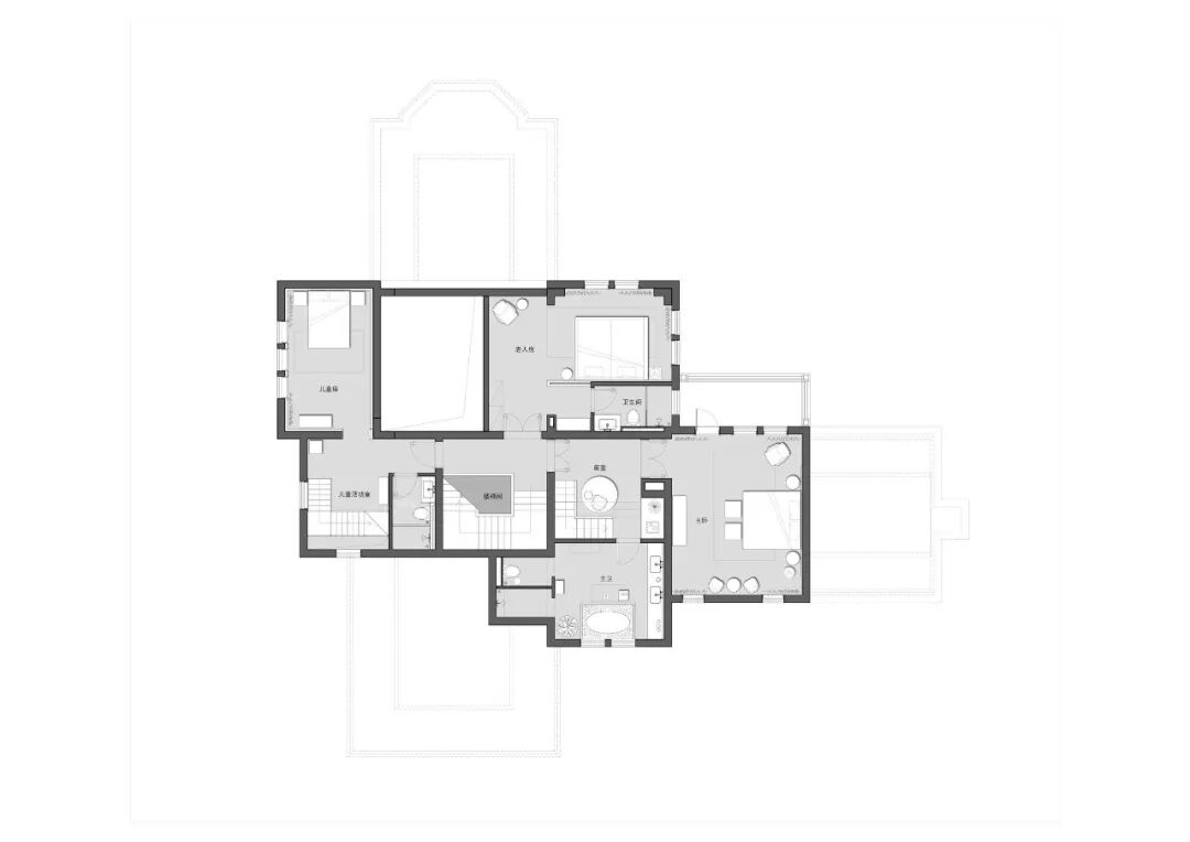 楼梯正对的老人房光照充裕,得益于透光却不透明的冰柱玻璃隔断,床侧的扶板设计也兼备很了实用功能。