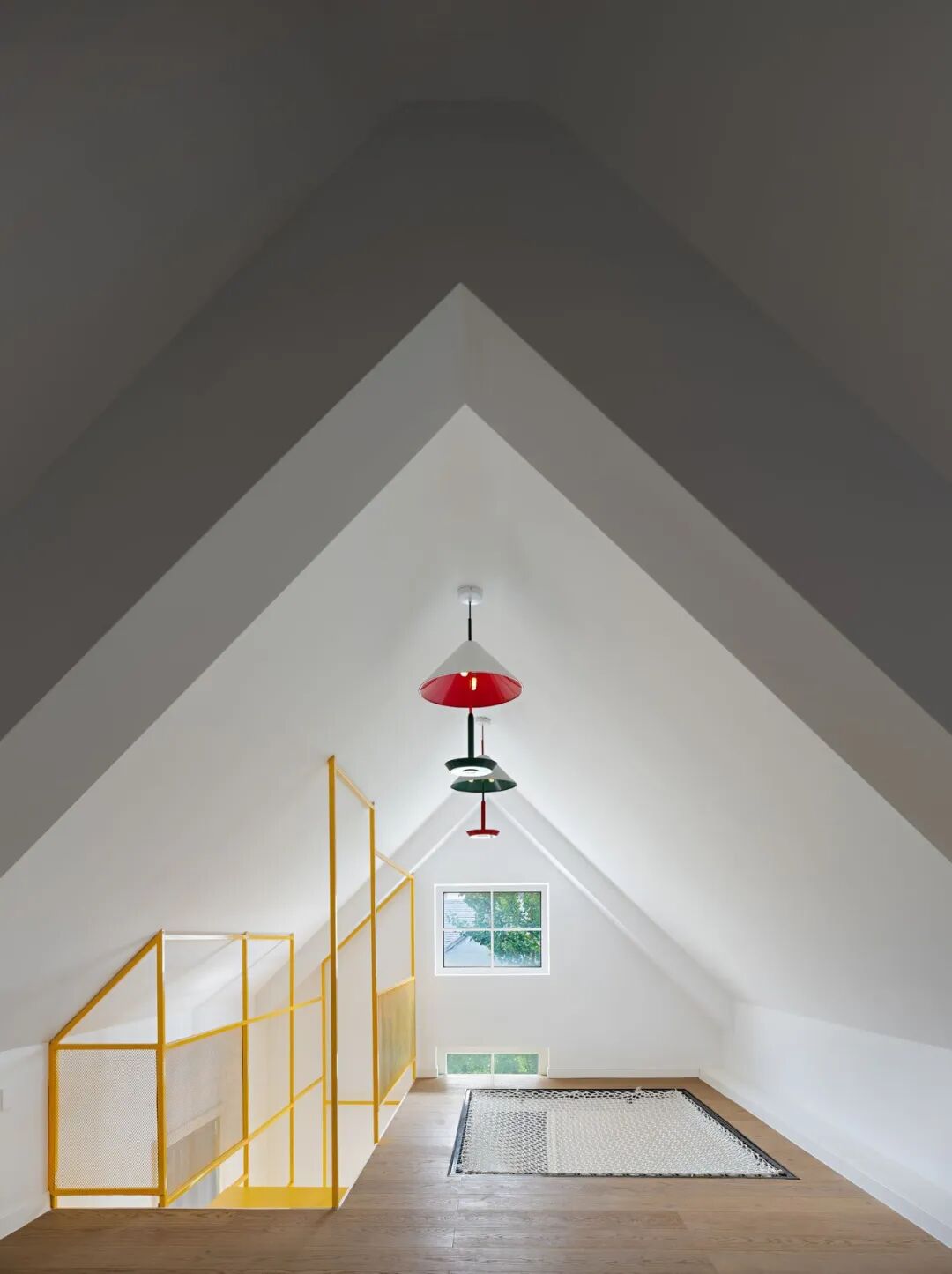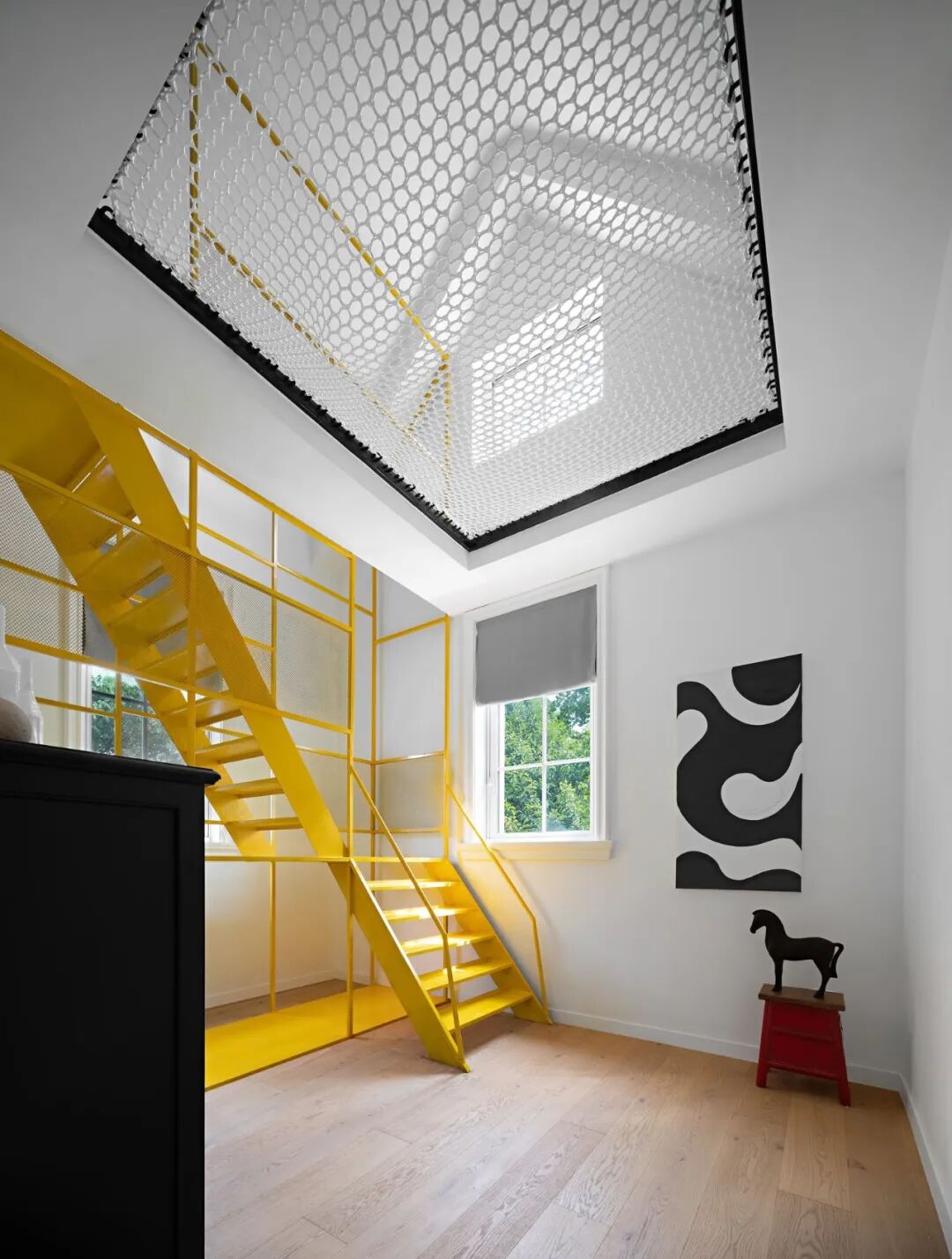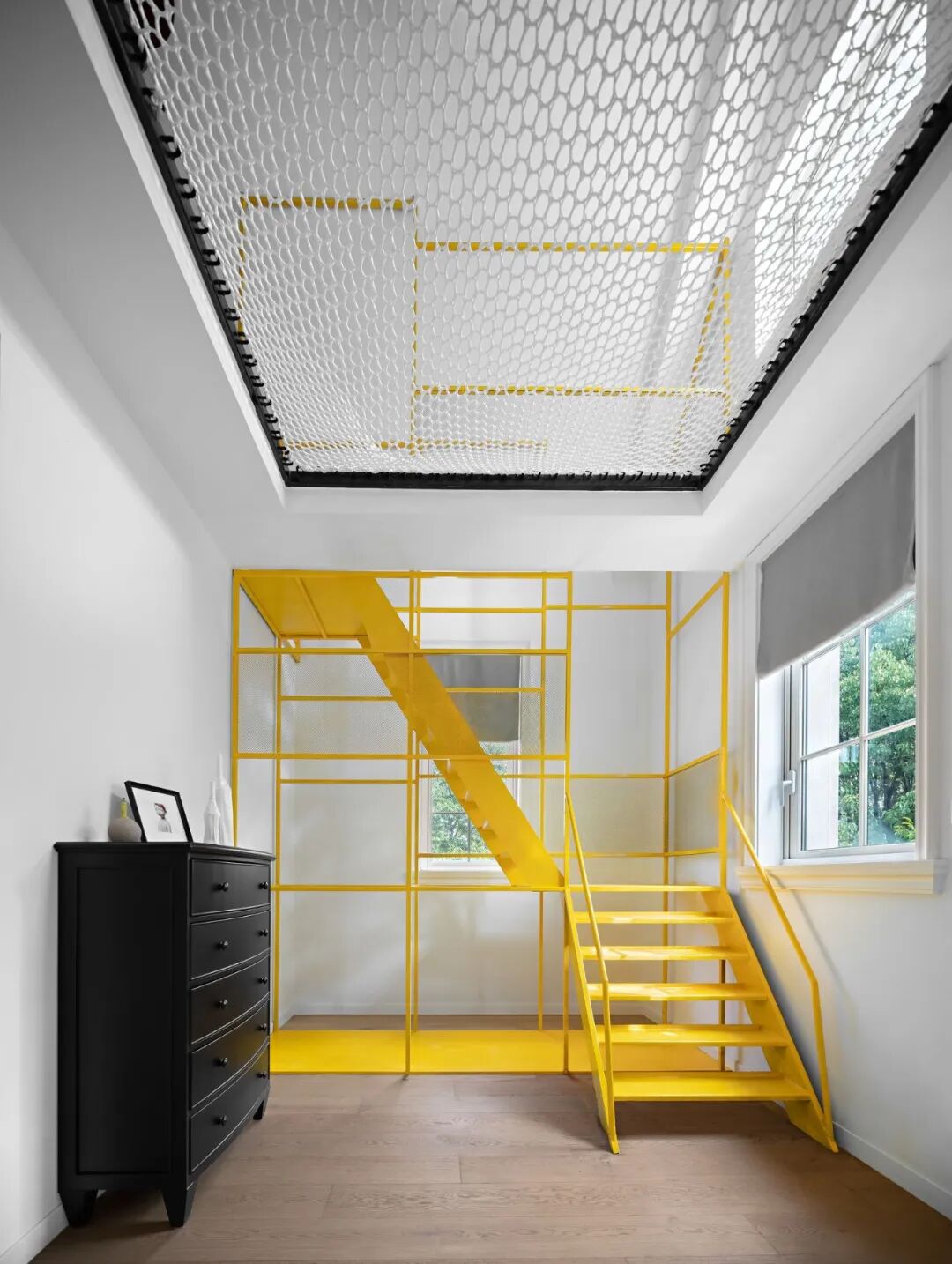 儿童房是由原玄关中庭加建出来的,保留了建筑原有的石材墙面。设计师以原房间结合顶部的高度,做了一个充满趣味的儿童活动区:明黄色的攀爬梯与白色睡绳网,不需装饰就很受欢迎。