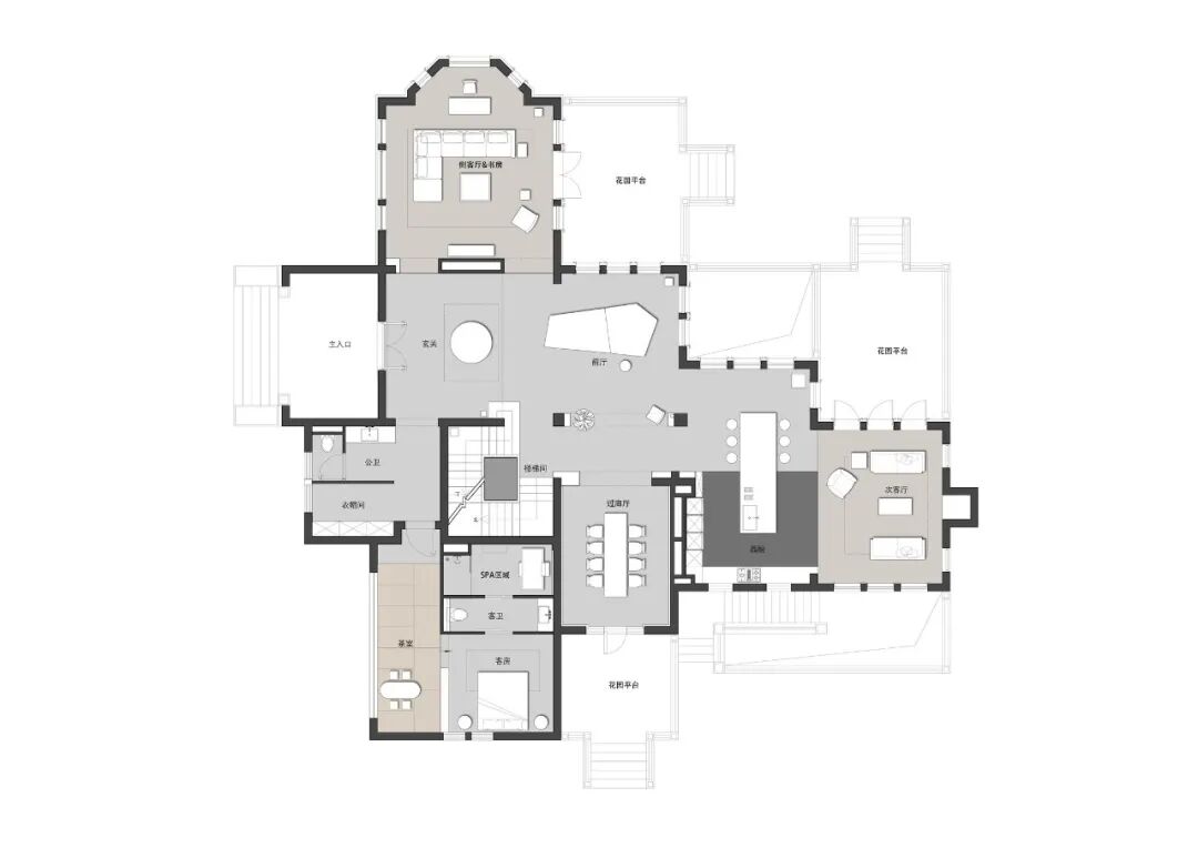 次客厅正面保留了原建筑壁炉,并选用浅灰色小荔枝面花岗岩套嵌。侧厅沙发不仅与壁炉形成对话,也与开放式西厨形成相互渗透的交流态。实际上,前厅也因与之类似的延伸态势而获得空间张力。