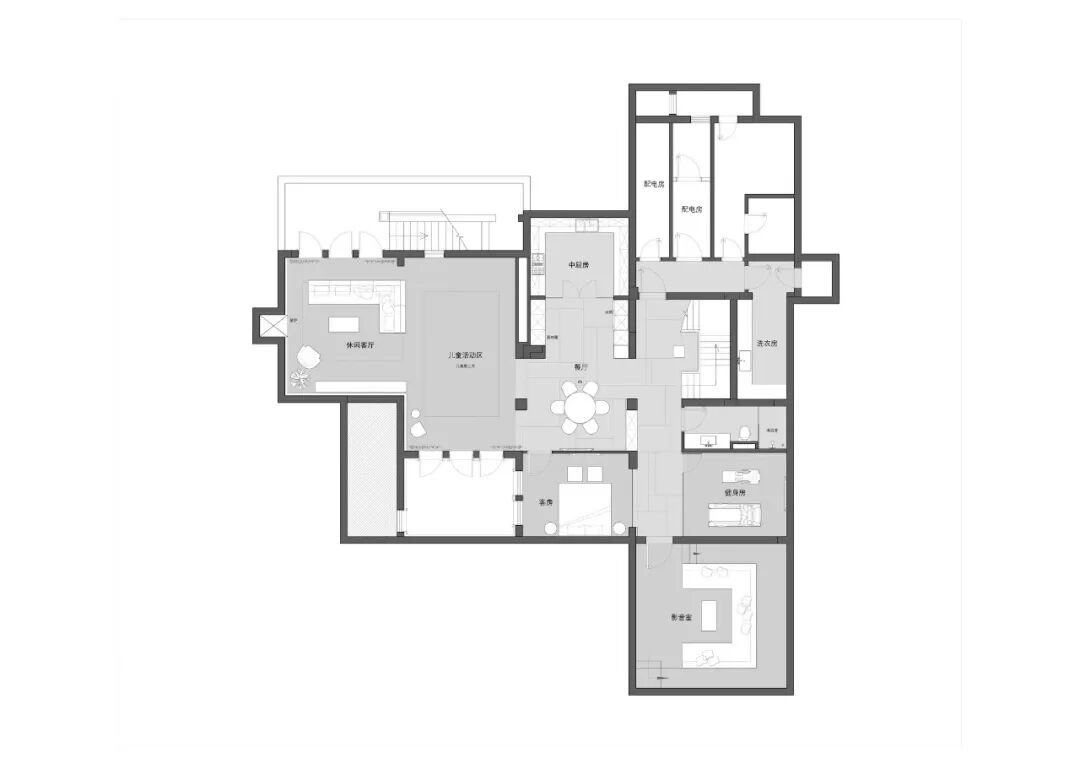 如咏叹调一般注重独立个体的情感宣泄和自由驰骋的空间,别墅中的私人区域都各具特色。负一层主要是休闲娱乐区和中式餐厨区域,以娱乐为主的健身和影音室地面由精致的铜条分割。