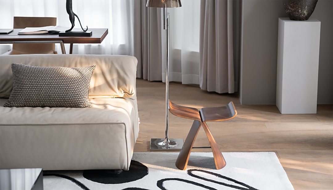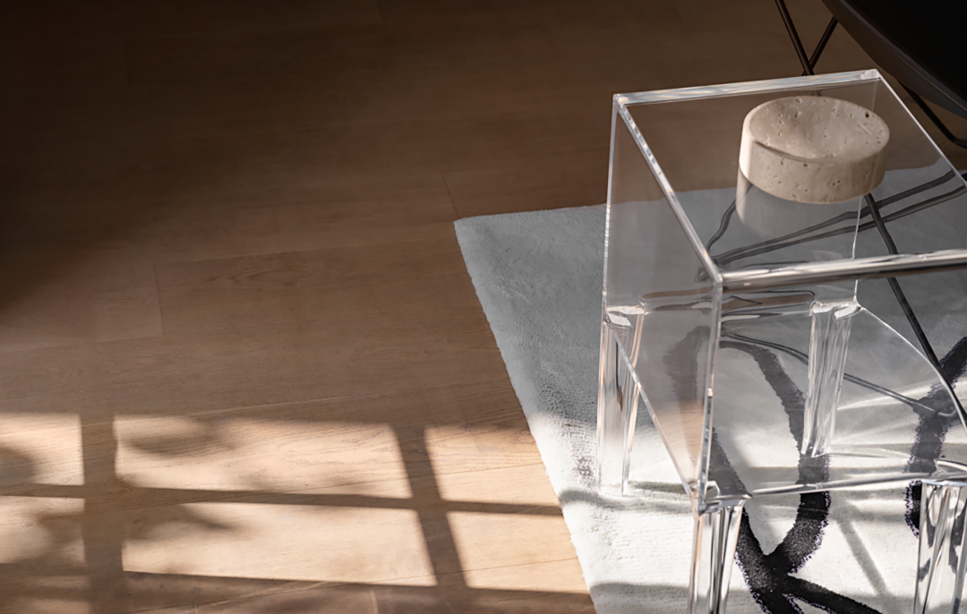 明亮鎏光,动静有致。暖色橡木地板来自全球高端原木地板品牌——Der·1863。表面采用烟熏工艺对地板进行雕琢,呈现最真实的原木印痕与细腻的触感。