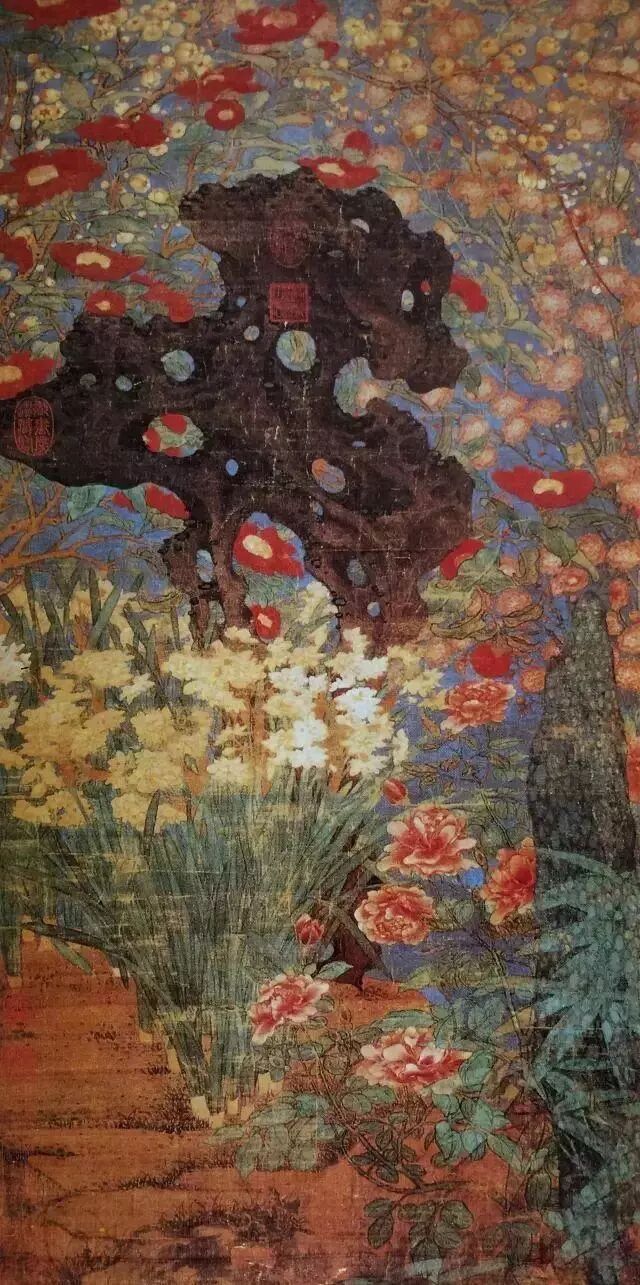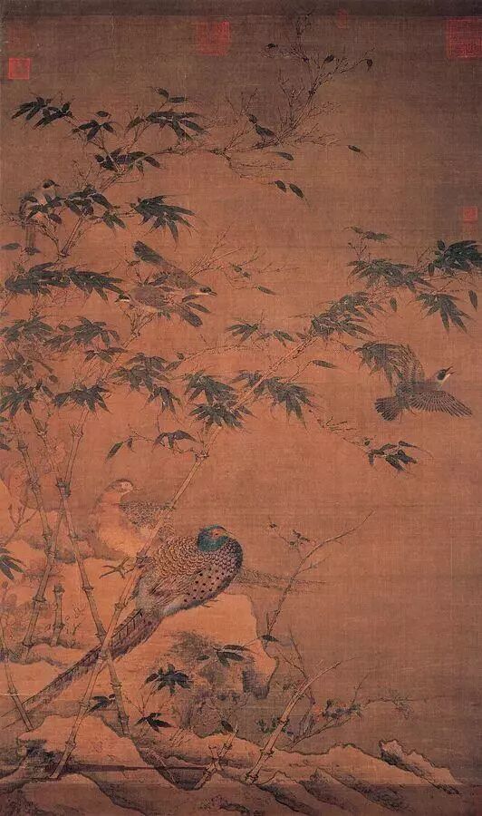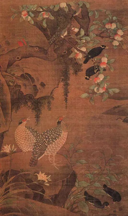 宋代《宣和画谱》所载北宋宫廷收藏中,有三十位花鸟画家近二千件作品,所画花卉品种达二万余种。北宋的花鸟主要还是承接五代的传统,早期以黄筌之风格为主导,基本上用的是“勾勒填彩”法,旨趣浓艳,墨线不显。到了南宋,画院一半以上的画家画花鸟,这一时期的花鸟画是中国花鸟画发展史上一个高峰。