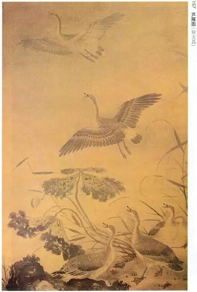 五代是中国花鸟画发展史上的重要时期,以徐熙、黄筌为代表的两大流派,确立了花鸟画发展史上的两种不同风格类型,“黄筌富贵,徐熙野逸”,黄筌的富贵不仅表现对象的珍奇,在画法上工细,设色浓丽,显出富贵之气,徐熙则开创“没骨”画法,落墨为格,杂彩敷之,略施丹粉而神气迥出。黄筌之子黄居寀、居宝,徐熙之孙徐崇嗣、崇矩都是当时花鸟画的重要画家。