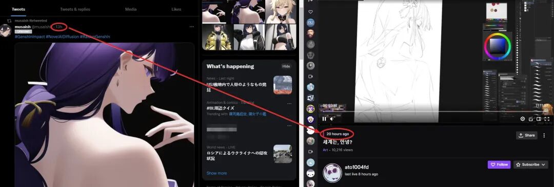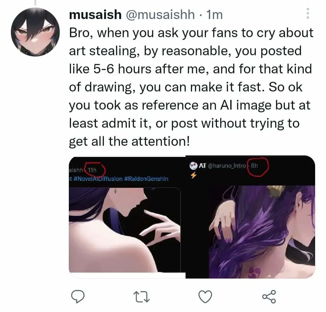 事情的起因是推上一位名叫的AT(@haruno_intro)的画师,他常在Twitch上直播绘画,但是就在一次直播绘制的过程当中,一位ID为@musaishh的用户截取了未完成图,然后使用AI绘画工具生成了一张图片并抢先发布,并未标注来源,只加上了AI创作的Tag。