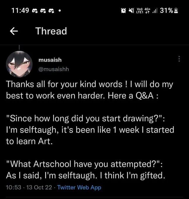 引发网友讨论之后,这位竟大言不惭表示自学绘画一周,觉得自己很有天赋,然后紧接着又再次发表一张图片,没想到又被扒出来盗用了另一位画师的作品。