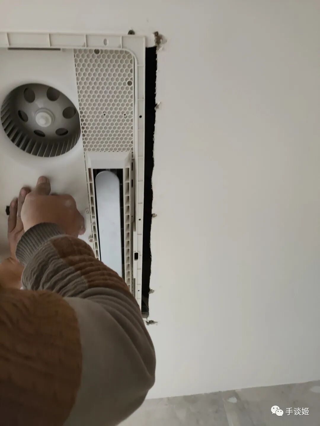 1、师傅说姬家里的厕所的吊顶开口不够大,要求扩孔。原本扩孔是按照官方要求的尺寸处理的,但既然安装师傅说小了,还能怎么办呢?听他的,扩大呗。