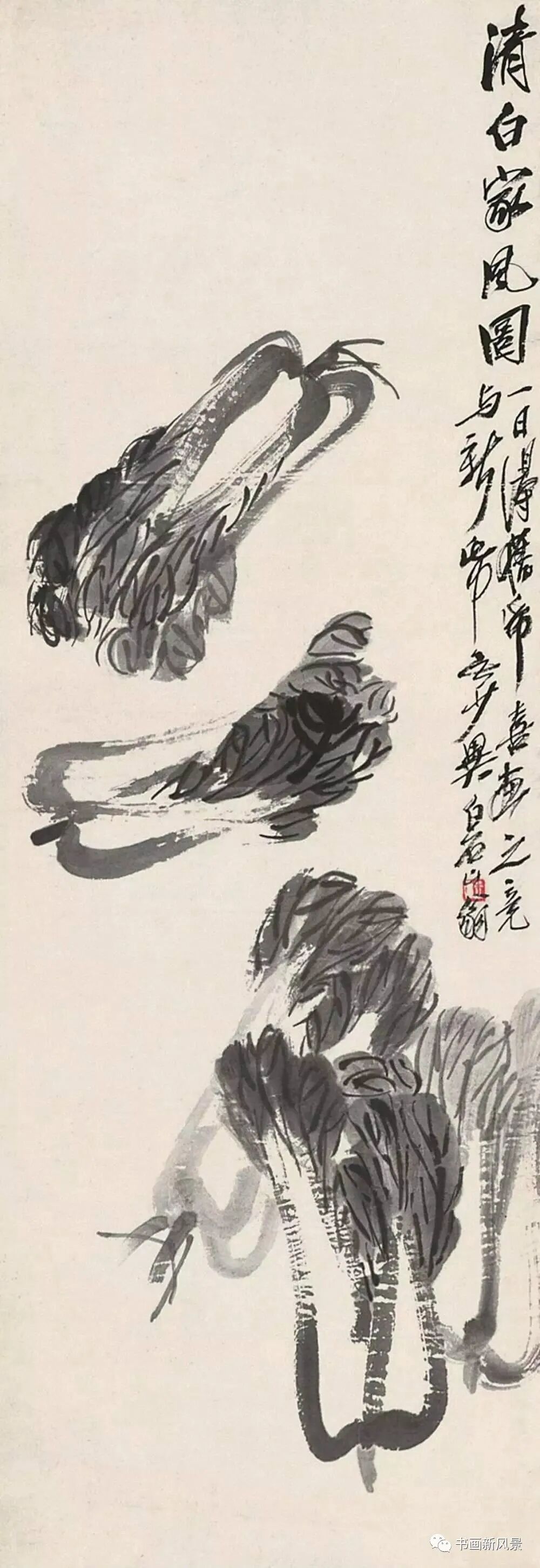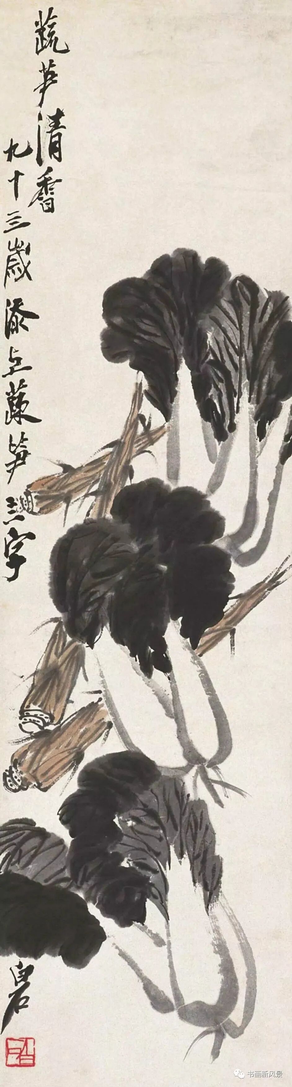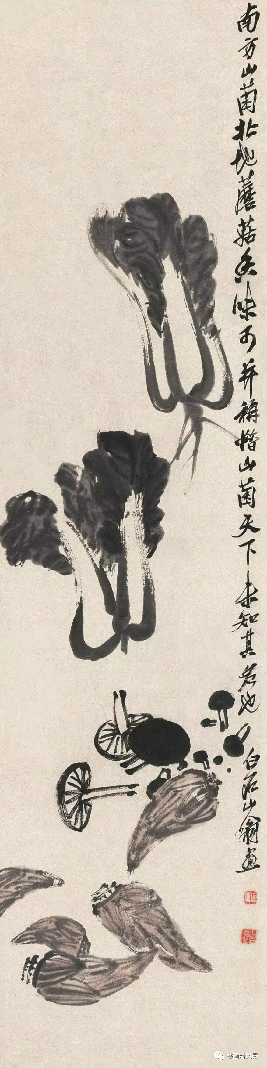 最新文章2023-09-06 立冬,看看中国美术馆收藏的齐白石大白菜! 齐白石 清白传家 中国美术馆藏 白菜,谐音“百财”,寓意财源滚滚,同时它的菜叶是青色,菜帮为白色,象征清清白白,故成为文人画家们喜欢表现的一个题材。 齐白石 清白家风 中国美术馆藏 白石老人一生喜画白菜,并且非常愿意向大家告白他的农家身份,他曾在《白菜》上题诗句:“不独老萍知此味,先人三代咬其根。”又题:“牡丹为花之王,荔枝为果之先,独不论白菜为菜之王,何也?”可见,在齐白石眼里,白菜的地位非同一般,画家是将白菜视为“菜王”看待的。 齐白石 到头清白 中国美术馆藏 齐白石笔下的白菜特别的鲜活,处处都透露出旺盛的生命活力和浓郁的生活气息。老人用他那简练的笔墨,诙谐有趣的画面语言,为我们展现了一幅幅饱含别样情思的生动图画。可以说,把白菜画出了名,是从齐白石这里开始的。。。 齐白石 菜笋香 中国美术馆藏 齐白石 白菜竹笋山菌 中国美术馆藏 齐白石 清白传家 中国美术馆藏 齐白石 白菜萝卜 中国美术馆藏 齐白石 蔬笋清香 中国美术馆藏 齐白石 白菜 中国美术馆藏 齐白石 白菜和小辣椒 中央美术学院藏 齐白石 清白传家 清华大学美术学院藏 齐白石 白菜蟋蟀 西安美术学院藏 齐白石 白菜小鸡 首都博物馆藏 齐白石 白菜蚂蚱 天津艺术博物馆藏 齐白石 白菜萝卜 辽宁省博物馆藏 齐白石《花鸟蔬果杂画册》中的白菜辣椒 题识:牡丹为花之王,荔枝为果之先,独不论白菜为菜之王,何也? 本文来自微信公众号“书画新风景”(ID:shuhuaxinfengjing)。大作社经授权转载,该文观点仅代表作者本人,大作社平台仅提供信息存储空间服务。 TAGS: 白菜美术菜馆藏齐白石 相关文章英赫日报 | 李宁 × 空…米兰时装周的异星来客,用结…米兰“MoLo”移动与物流…西班牙艺术家 Juan d…把小鸟画成美少女,她弃医从…这些鸡蛋包装不只是有趣,设…国产文具又炸了!晨光再造“…七点资讯 |《更衣人偶坠入…AlphaDraw筑绘通「…秦始皇的黑,是你不懂的黑。
