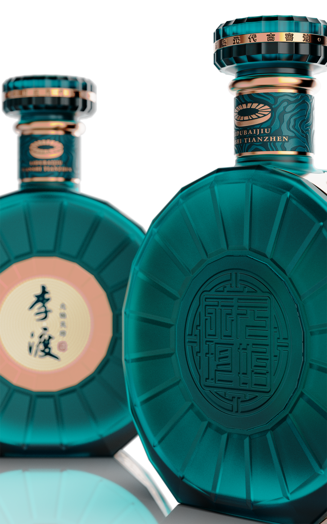 「李渡·元始天珍酒」瓶型设计汲取自李渡专属的元代窖池概念,将窖池以瓶体的形式呈现。凹凸有质的瓶身,精致而高雅,给消费者最直观的视觉印象,并加深消费者对李渡文化的了解。