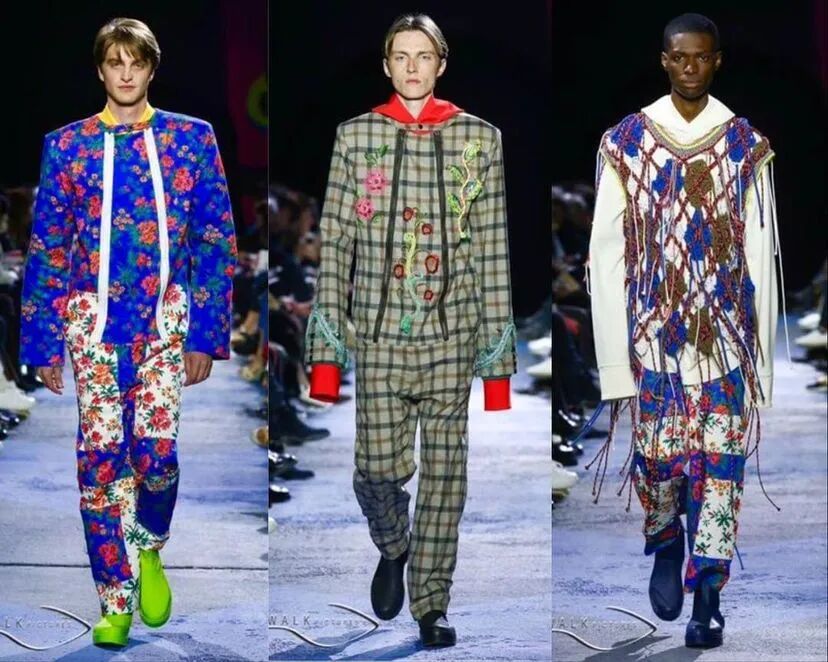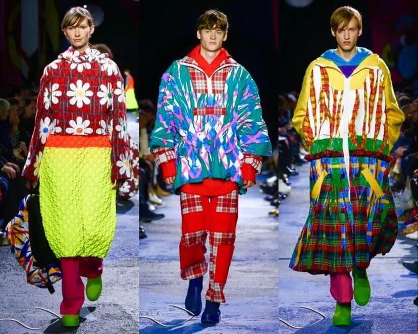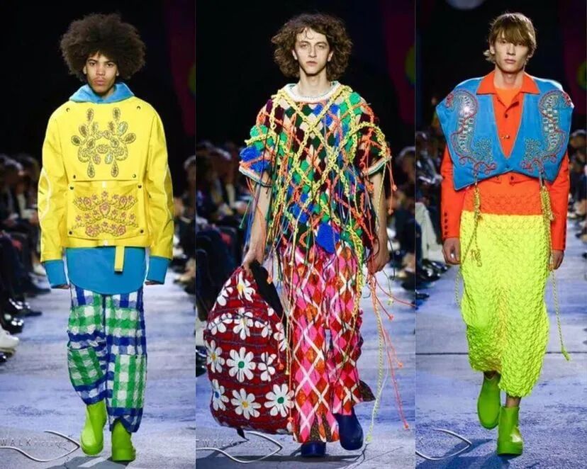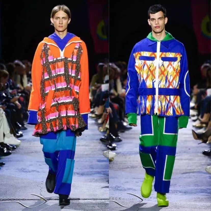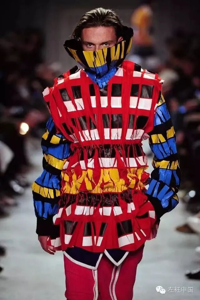 设计师将金箔薄片、珍珠、亮片、圆宝石与弹簧钩结合,登山爬绳被修剪辫饰缠绕;传统手工与新科技、男性服装与女性服装的高敏感混种在带有科技感和高彩度鲜艳的jersey运动面料上。
