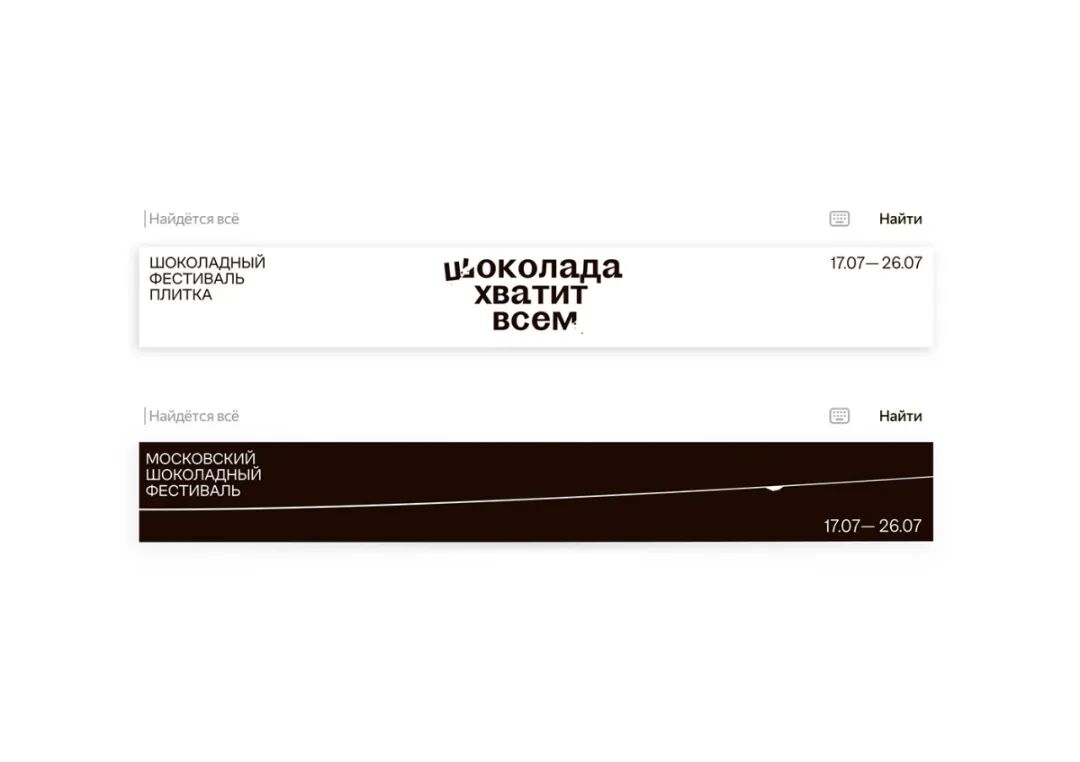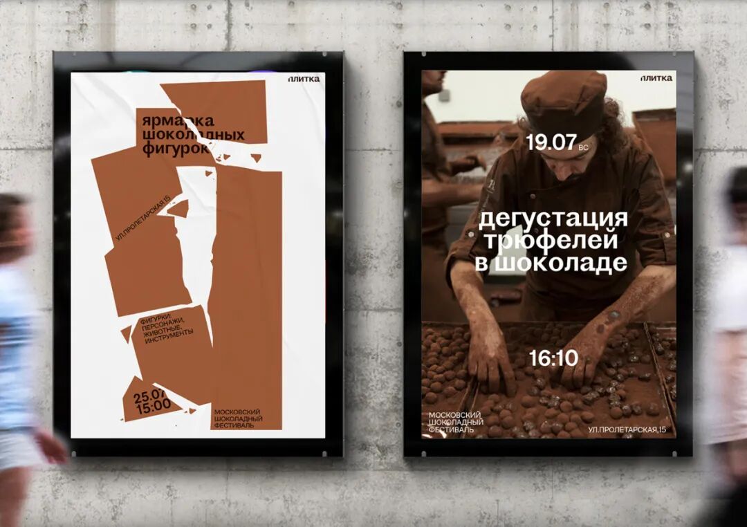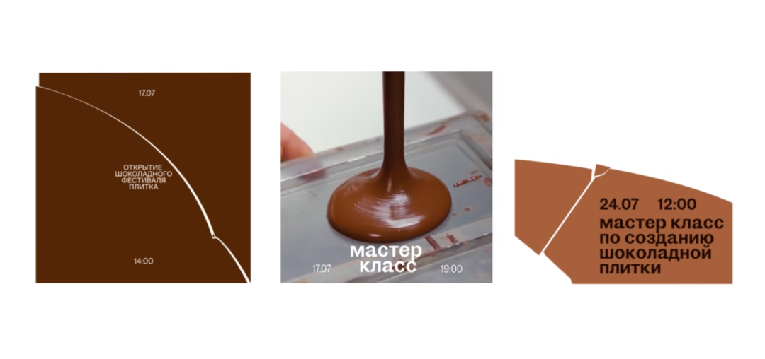 Плитка — это первый крупный организованный фестиваль шоколада в России, который проходит в Москве. Помимо дегустаций и мастер классов от известнейших во всём мире шоколатье, гости фестиваля смогут увидеть шоколадные скульптуры, шоколадную живопись и даже шоколадную одежду. Главный слоган "плитки" — шоколада хватит всем.Plitka is the first large chocolate festival in Russia, which takes place in Moscow. In addition to tastings and workshops from the world's most famous chocolatiers, guests show the ability to see chocolate sculptures, chocolate paintings and even chocolate clothes. The main slogan of the «Plitka» is that there will be enough chocolate for everyone.The identity is based on the main slogan of the festival “chocolate is enough for everyone”. Therefore, the graphics are based on all kinds of eating chocolate: you can chip it, cut it, crumble it — it will not end anyway. The range of using this technique in graphics is quite wide: from breaking off a small piece for tasting, to breaking the whole chocolate bar. You can also use this method and chip typography. Sometimes only chocolate crumbs may remain on the layout, what complemented by copyrights. For example «The final day of the festival».
