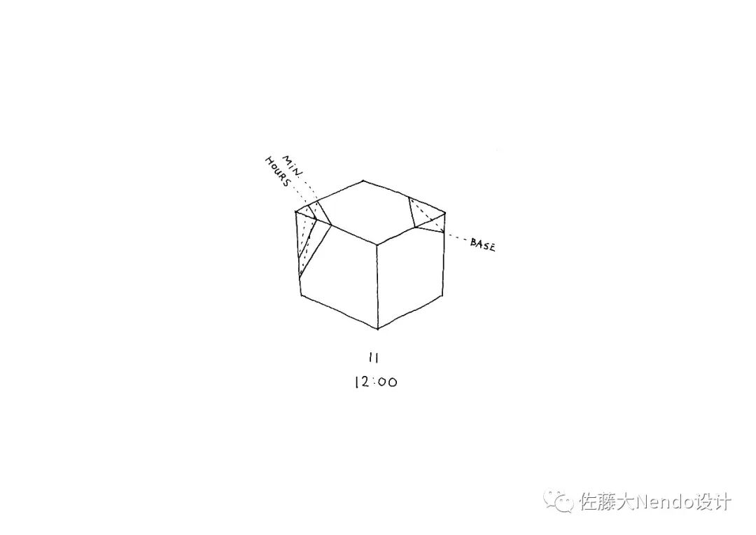 我们把一个倾斜的立方体设计成了时钟,立方体切去的一角使时钟能够在平面上保持平衡。
