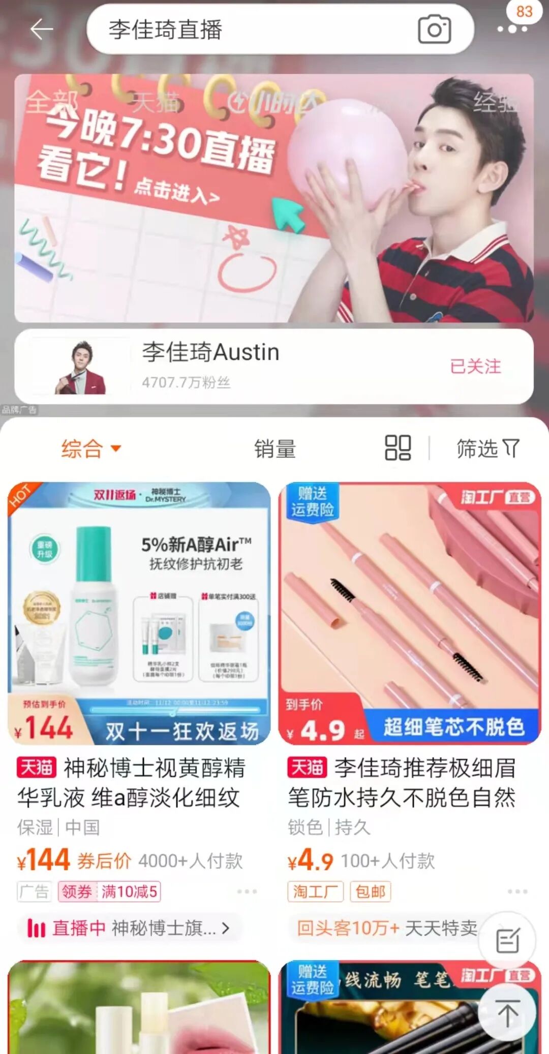 双11预售第一天,“李佳琦直播顺序” “李佳琦的种草能力有多强”“李佳琦好像黄金矿工卖道具的”等词条在频繁出现在微博热搜。直播结束后,与李佳琦相关的各种段子广泛出现在各个社交平台,李佳琦直播间不仅成为了用户双十一抢购的主战场之一,他本人也几乎成为了本次双11的代言人。