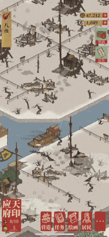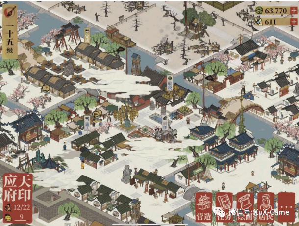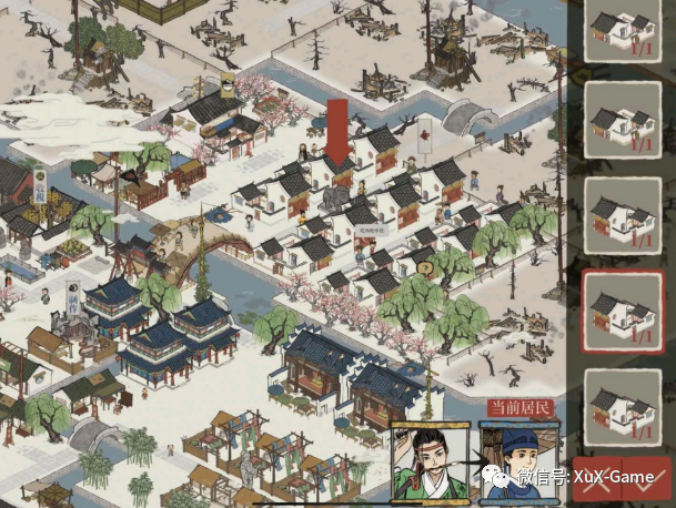 音效制作上,全局以轻松婉转的古筝、琵琶弹奏的配乐为主,而在点击进一些场景(如施工建造)中时,会故意呈现一些嘈杂的伐木、工具敲打、人声聊天的音效,通过在BGM中融入生活性的元素,从听觉方面营造真实的市井氛围,给玩家强烈的代入感沉浸感。