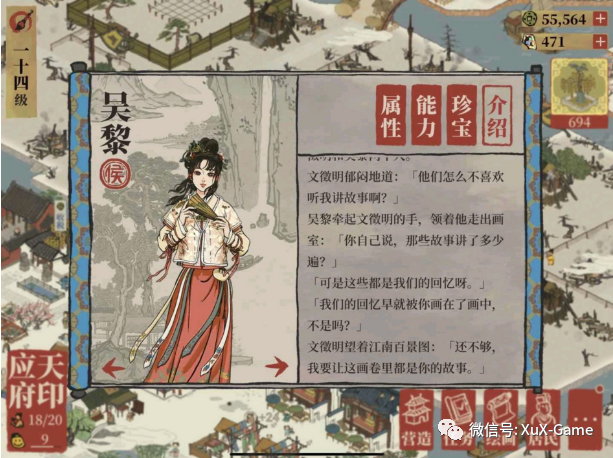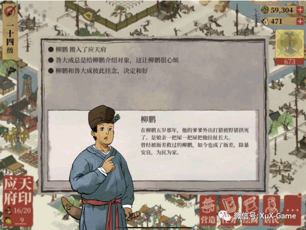 不同于moba等竞技类游戏对玩家情绪大起大落的操控,经营放置类游戏需要让玩家了解自己的世界观,更偏向于体验的情绪。《江南百景图》的题材本身是很有烟火气息的,NPC不仅是画卷中的纸片人,更有自己独特的生命感。每个小人物背后都有自己的小故事,居民之间时常发生着鸡毛蒜皮的故事与互动,特殊居民还存在着丰富的感情线,甚至一个装饰物品都有渊源。且故事设定并不是信手拈来,人物属性甚至也和历史上原型的性格和经历相关。