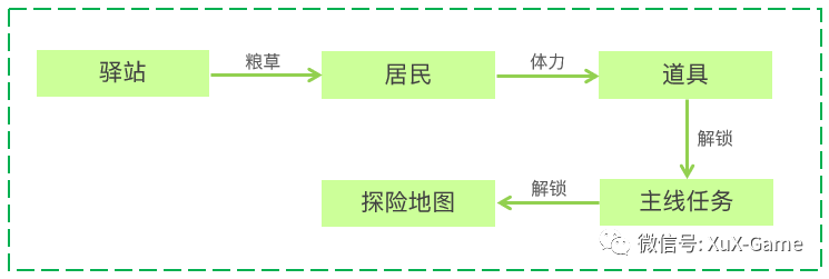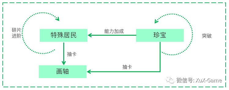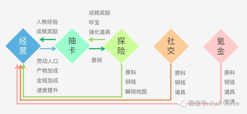 游戏的玩法与系统大致如下图。总体来说节奏是很舒缓的,主线经营生产环环相扣,辅助的抽卡、探险玩法增加乐趣,非氪非肝也能有良好的游戏体验。接下来将对每部分进行拆解分析。