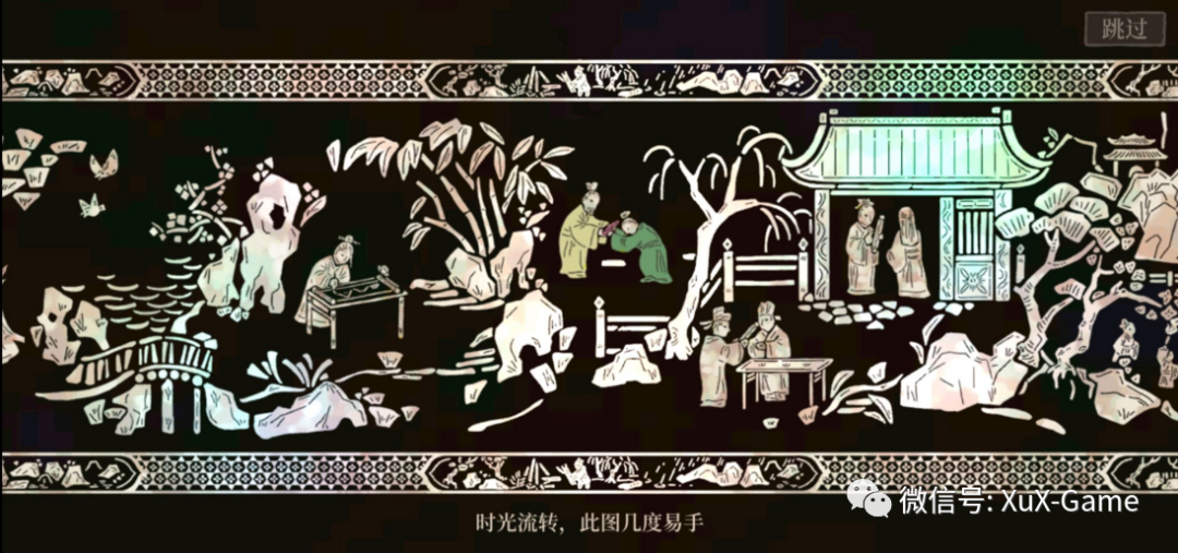 初进入游戏的PV动画里,通过展开长画卷呈现出一种螺钿漆器风格的艺术风格,表现较强的历史叙事感,自然地带玩家穿越到游戏故事中。动画讲述了《江南百景图》这个山河社稷图的来龙去脉,游戏其实是“画灵”文徽明苏醒后,需要修复烧毁的画卷。清除焚毁的枯木废墟、扩张城市也就是修复画卷的过程,每一次打造建筑都像是在画卷中添了几笔。