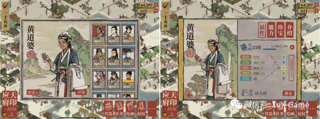 (1)查看属性:现阶段的界面跳转逻辑是【点击居民】-出现人物列表和第一位NPC图片-【点击详情】-弹出人物窗口-【点击进行升级/装备】。详细信息窗口的弹出动效会打断玩家的注意力,中断心流体验。个人感觉可以去掉中间的“展开画卷”的动效,直接在当前窗口的列表区域显示属性信息,或是在人物大图区域叠加一层底板显示人物的各类属性。