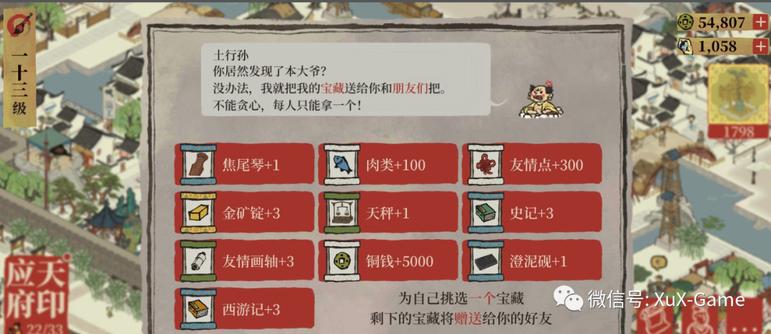 在这里,不是简单的加一个好友就能获得相应道具,《江南百景图》进行的一个巧妙的设计是,加了好友之后,时不时会有“土行孙”出现,他带着一批东西,人们可以从里面挑一个赠送给好友。这样玩家可以从中获得有所取舍的珍贵感,还需要时不时的保持在线才能赶上奖励,无形之中提高了玩家活跃度。