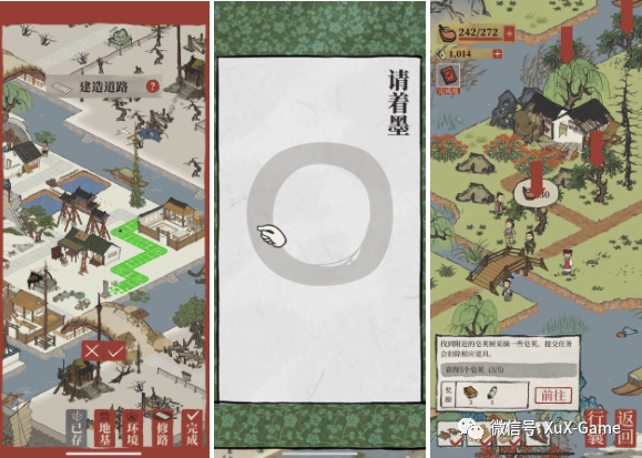 画面呈现上,印象深刻的是拖动地图时的加载方式。不同于大多数游戏的直接显示,《江南百景图》先勾勒出山水建筑的描边、再晕染黑白水墨、再上全彩,放慢的加载方式并不显得拖沓,而给人一种画卷徐徐展开的感受。所以并不是操作响应越快越好,找到细节进行合适的体验设计才能表现制作的用心。