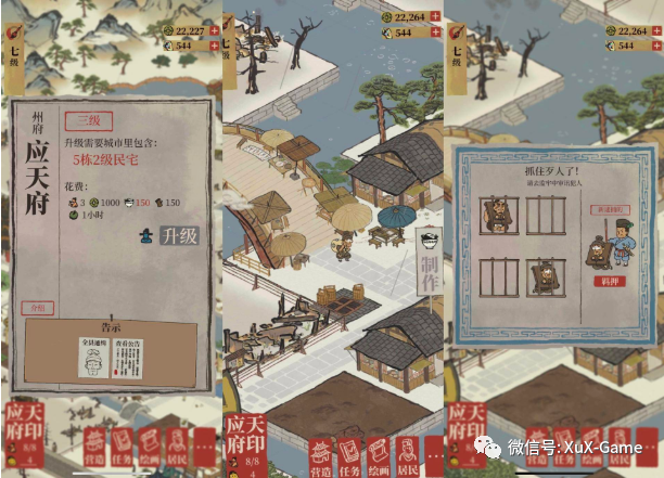 (4)为了保持游戏古风画卷的视觉效果,游戏中没有采用传统的进度条信息,而是在建筑/土地旁插一个风格相符的牌子,进度信息直接显示在文字色彩填充上。这样合并既为玩家展示了当前任务的进度信息,又不影响游戏整体视觉风格。