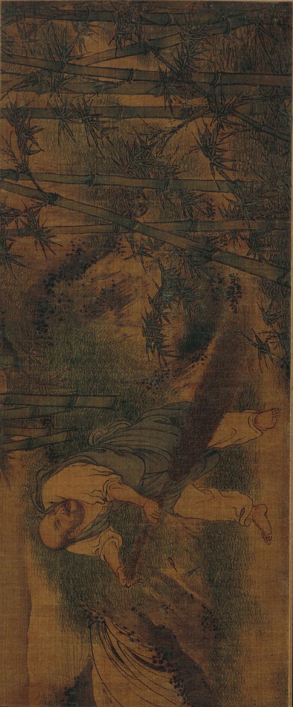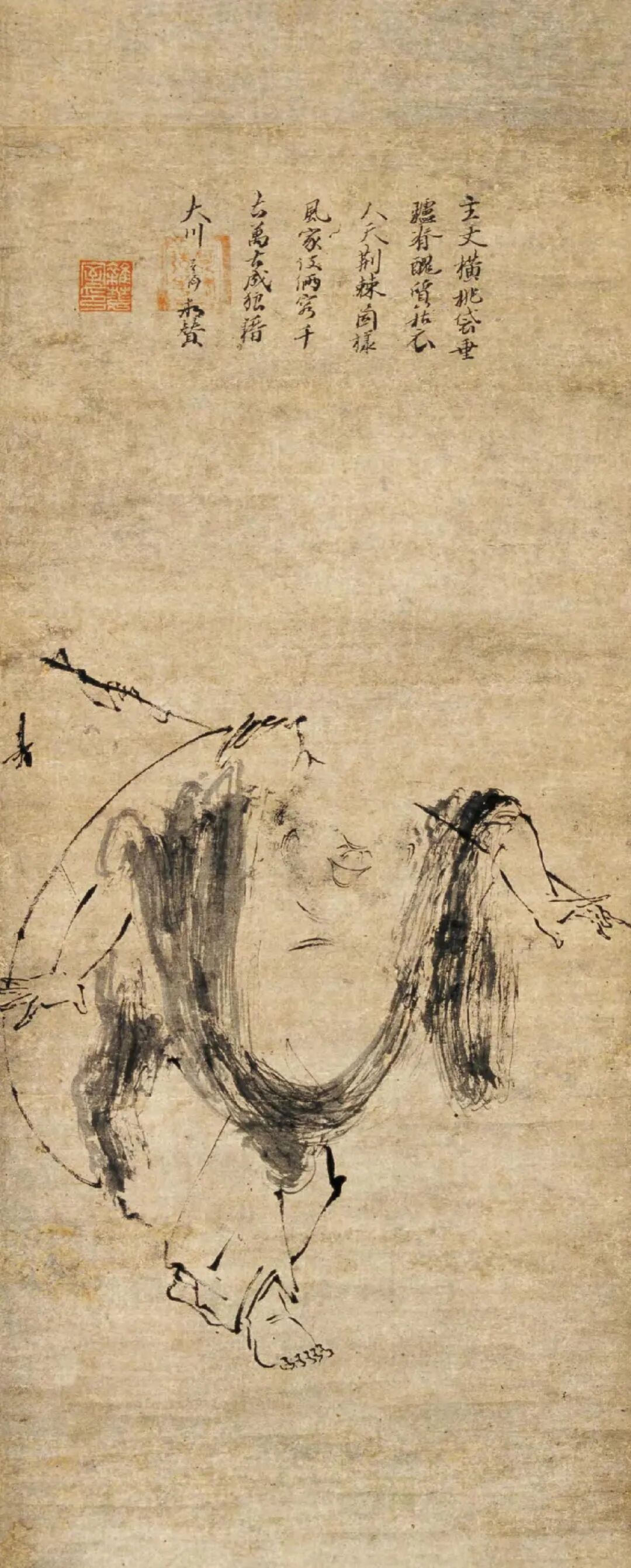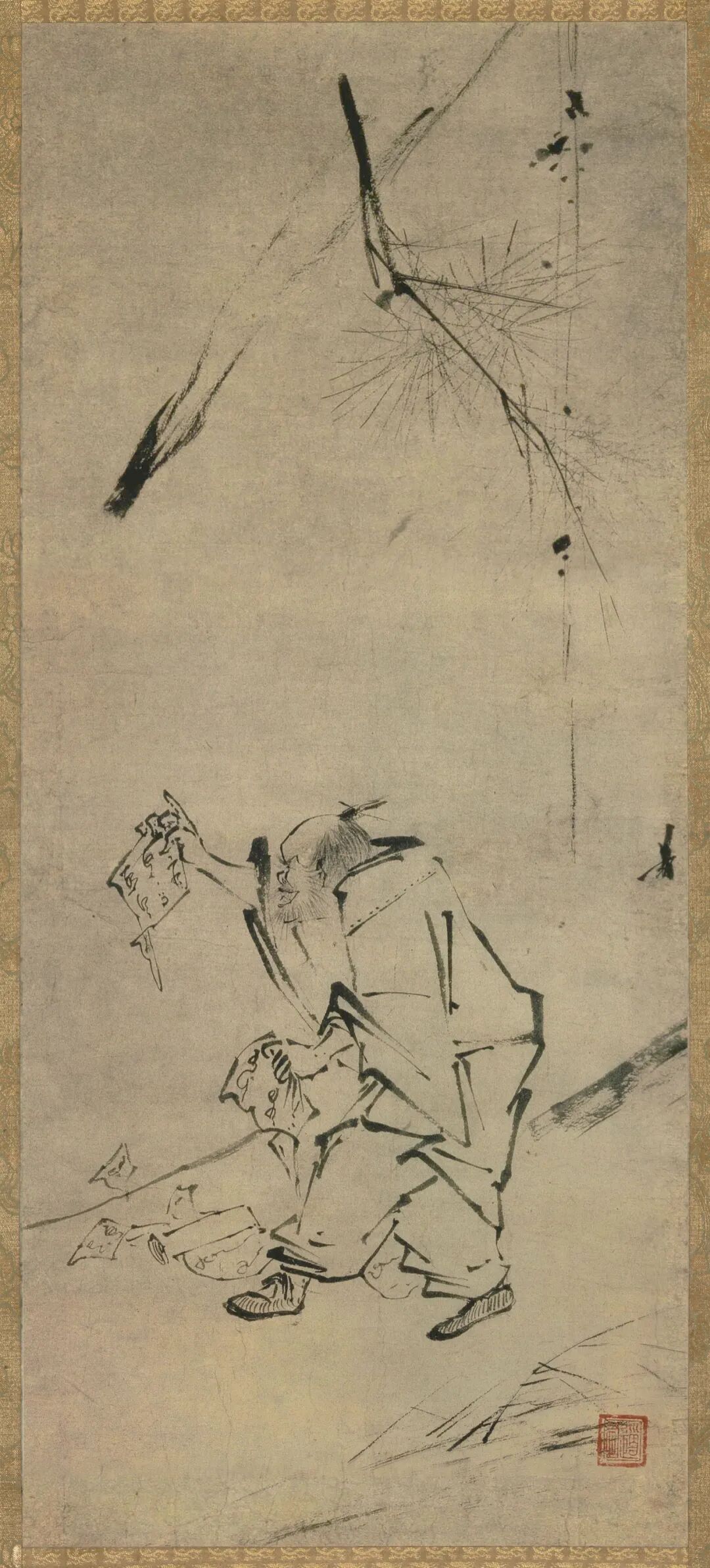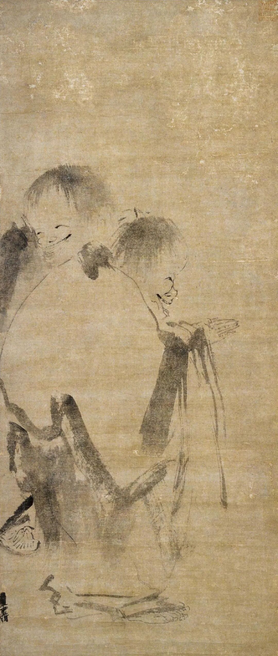 梁楷,生卒年不详,祖籍东平(今山东省东平县),善画人物、山水、道释、鬼神。宋宁宗嘉泰(1201—1204)年间画院待诏,赐金带,而梁楷不受,挂于院内,扬长而去。嗜酒以自乐,号曰“梁风子”。其绘画风格有两种,一种是为画院画家所敬佩的细笔法,另一种则是用笔简略粗犷的水墨人物减笔法。