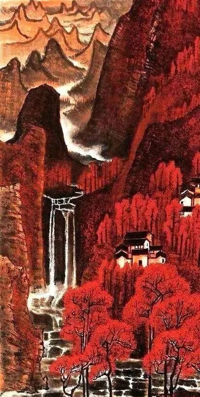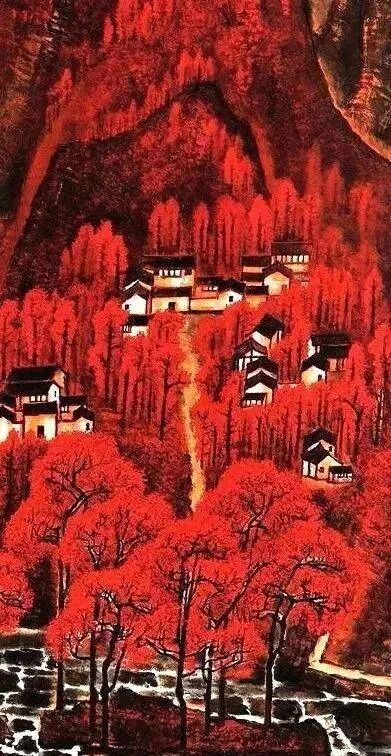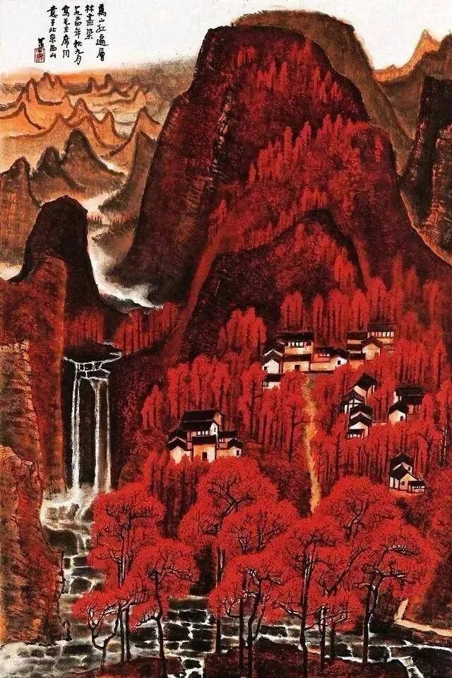 《万山红遍》是成就李可染在中国近现代画坛地位的里程碑式作品。该画题材取毛泽东“看万山红遍,层林尽染”诗意而成。1962至1964年之间,李可染偶得半斤故宫内府朱砂,大胆尝试用朱砂写积墨山水,总共创作7幅《万山红遍》。