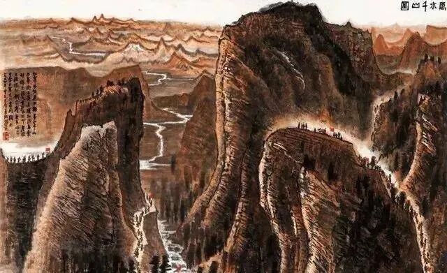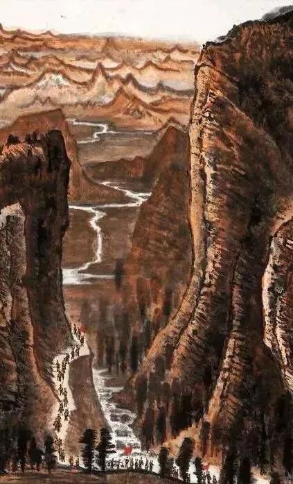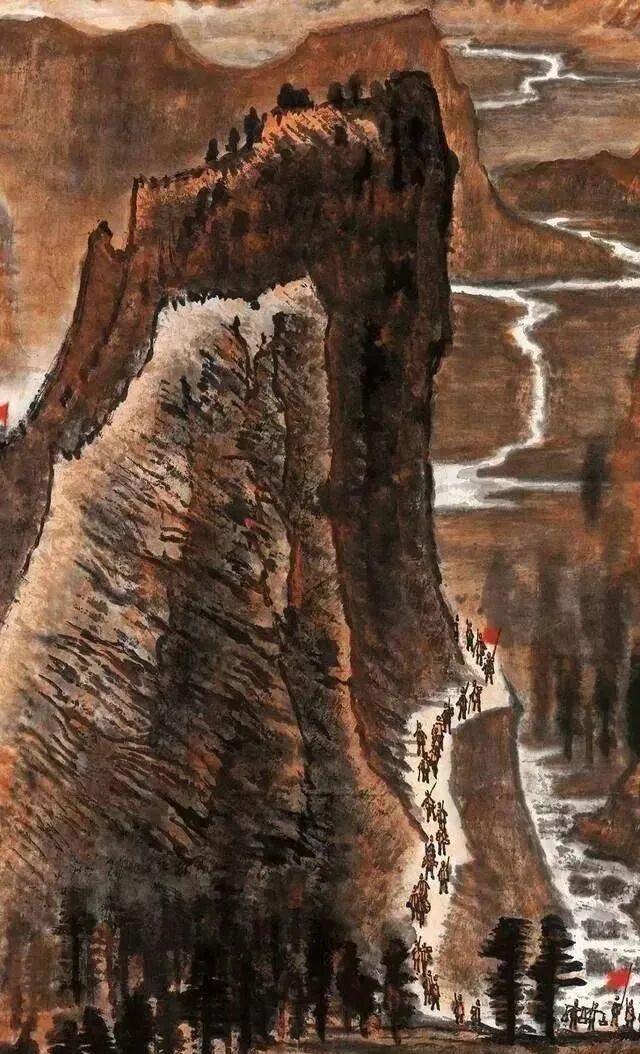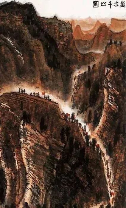 《万水千山图》是李可染1964年创作的,取材于毛泽东诗词《七律·长征》。画面上,层峦叠嶂、参差错落的群山雄奇壮丽,红军队伍绵延不绝。