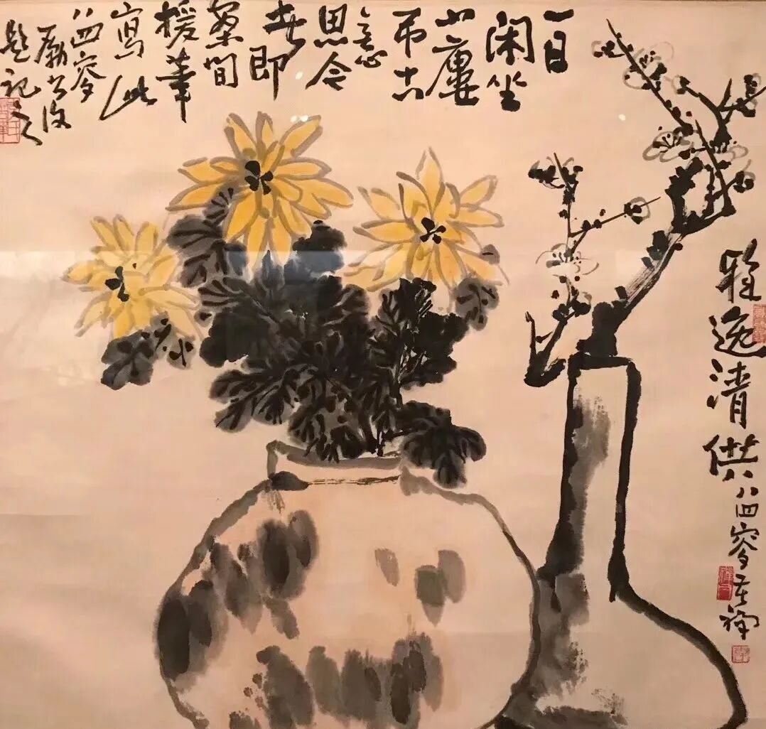 吴昌硕以深厚的书法篆刻功力作画,达到没人企及的高度,开创了大写意粗笔大墨的画风,强调金石味,这不同他前代的画家。