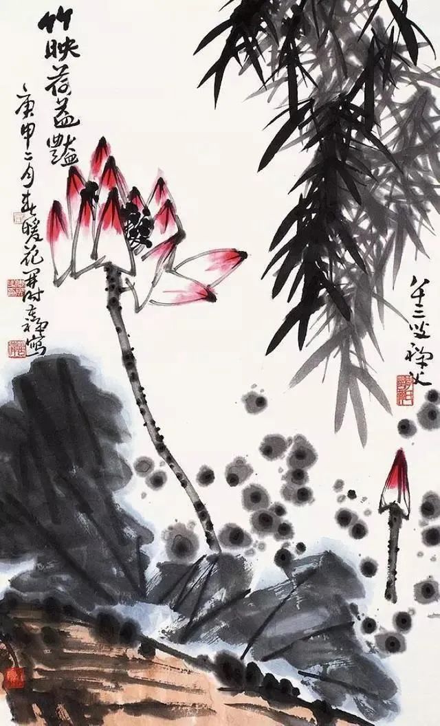 画花要了解花的知识。例如:石榴有好多种,古时牡丹迁洛阳,石榴迁河南,有的只开花不结果,花如牡丹大,红的、白的、黄的。“家有石榴更是家”,院中栽石榴,有多子、多实的吉利意思,也很好看,前人画石榴花题句有“:五月榴花照眼明”。我也爱题此句。