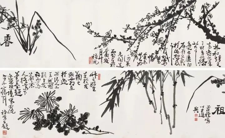 李苦禅继承了中国画的传统,吸取石涛、八大山人、扬州画派、吴昌硕、齐白石等人的技法,在花鸟大写意绘画方面豪放,气势磅礴,形象鲜明的风格,树立了大写意花鸟画的新风范。