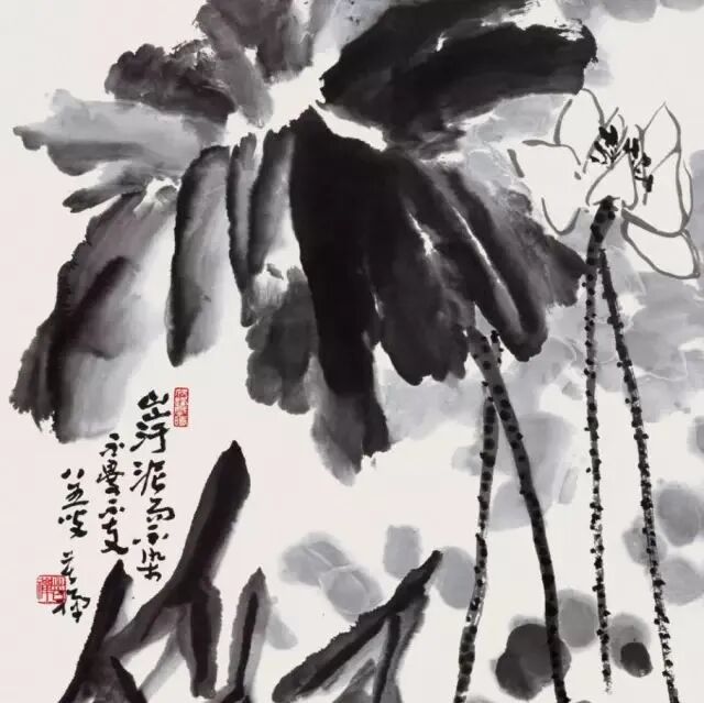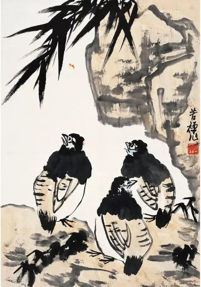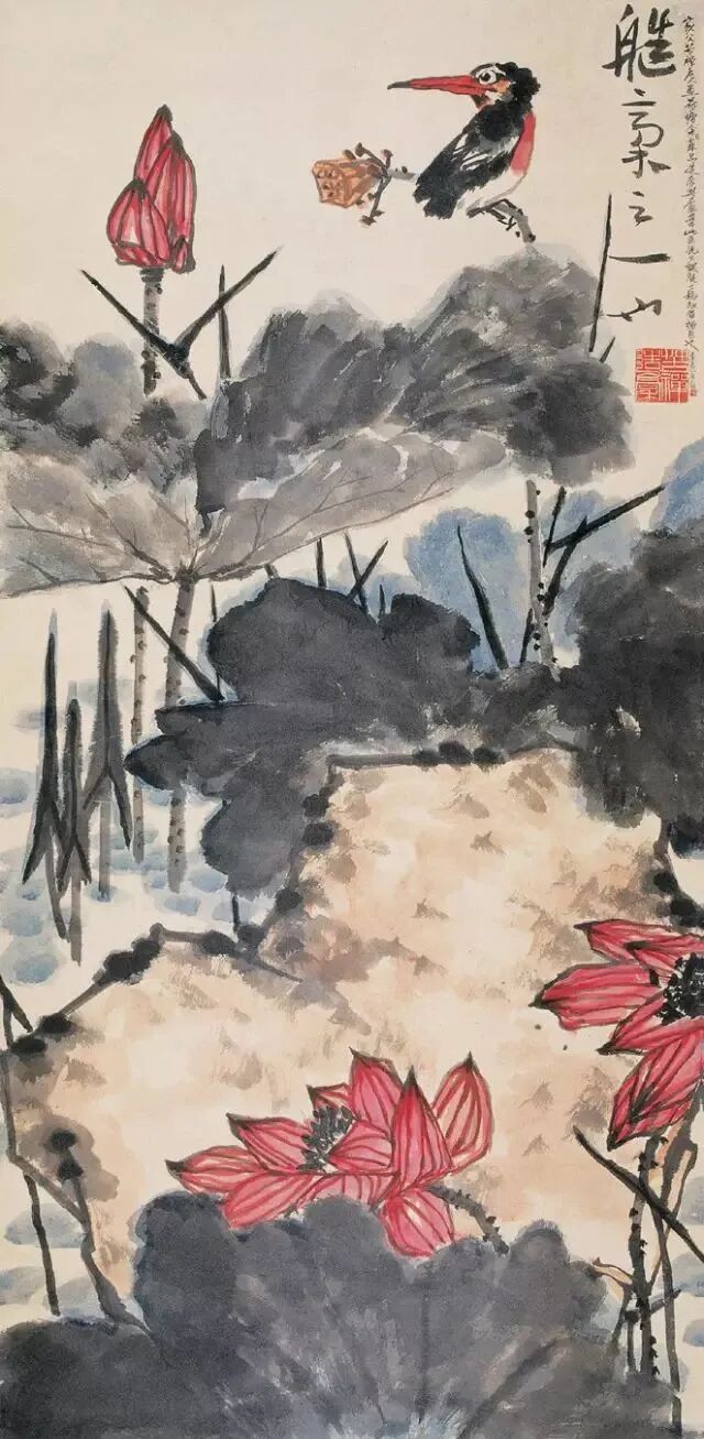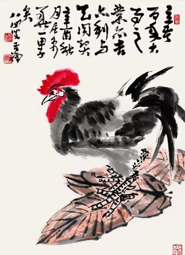 世人写“王字”多俗,唯八大山人写“王字”不俗。赵之谦用魏碑笔法作写意。吴昌硕用《石鼓文》笔意入画。齐老先生也如此,不过他练的是《汉三公山碑》、《吴天发神谶碑》和李北海的行书。不练书法就别想画好写意,这书法一门,是活到老,练到老;写意,它笔笔全都是写出来的!若没书法底子,只是画出来,描出来,修理出来,便没魄力,不超脱,显得俗气。