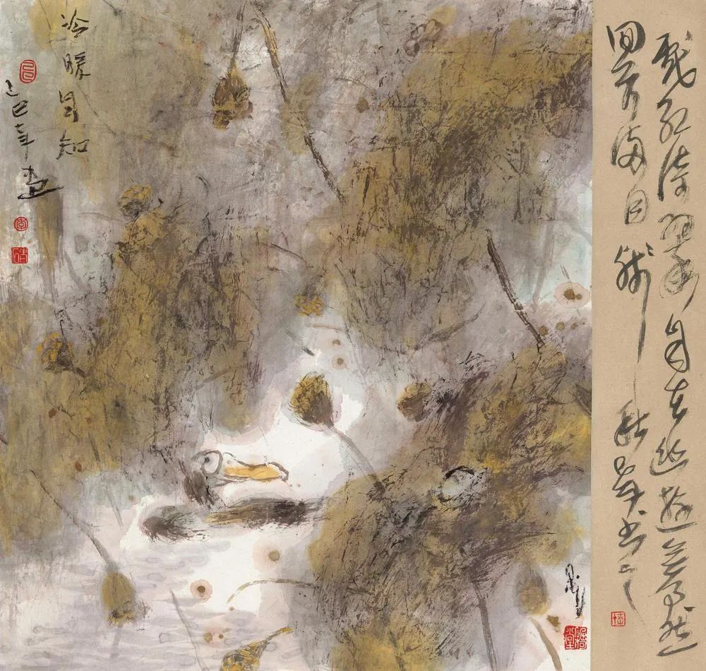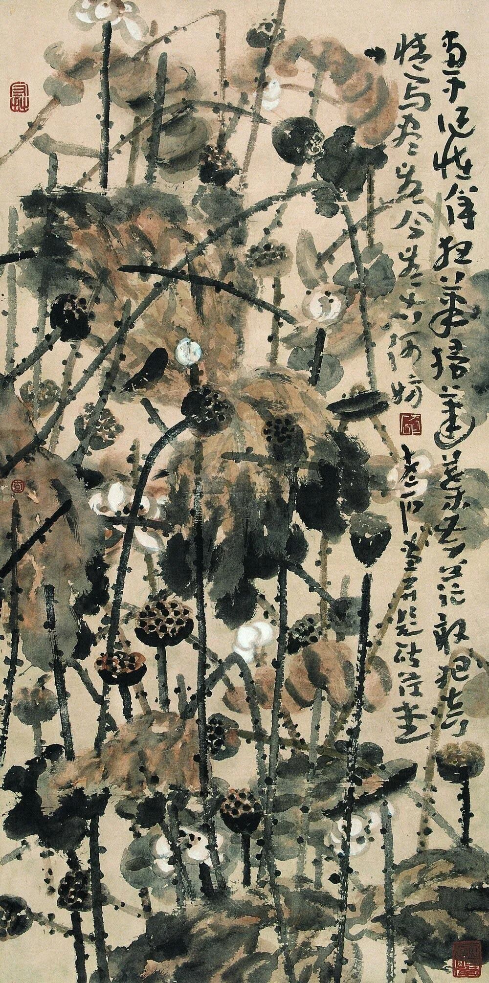 较早的一幅曰《野水荷秋图》,用淡墨、土黄和赭色画残叶与莲蓬,秋意苍茫而惨淡。后来他在此画的补题中自述了画荷的经过: