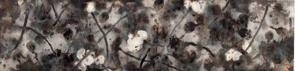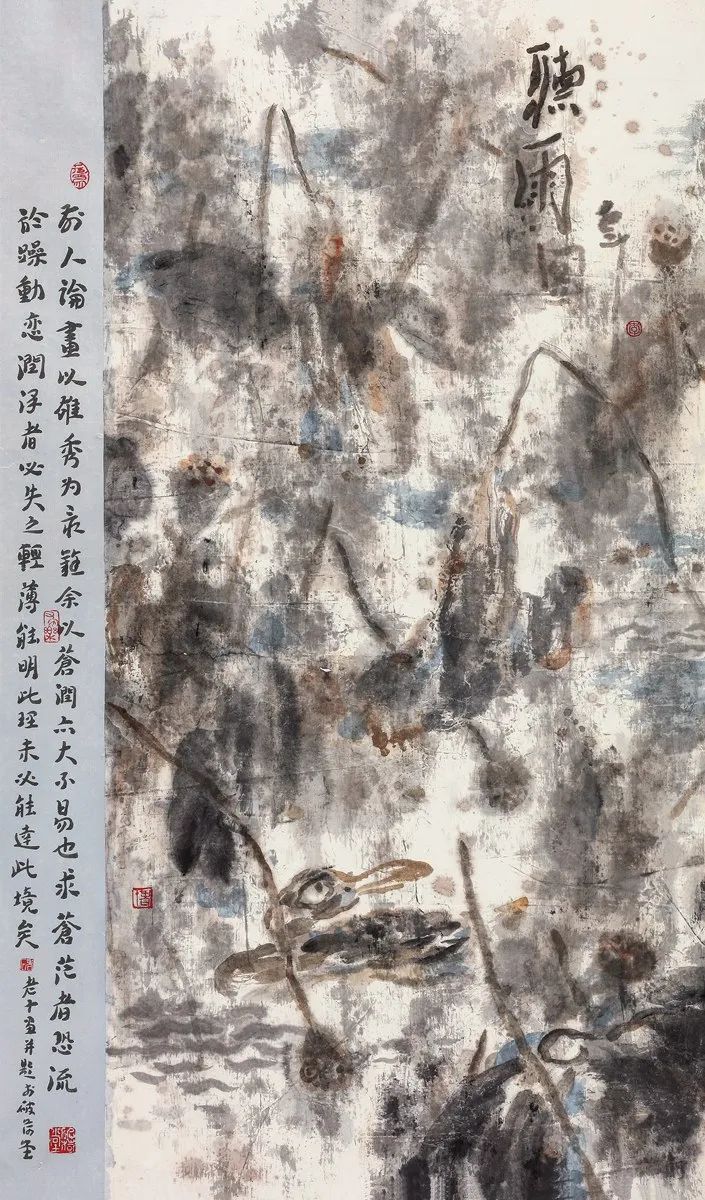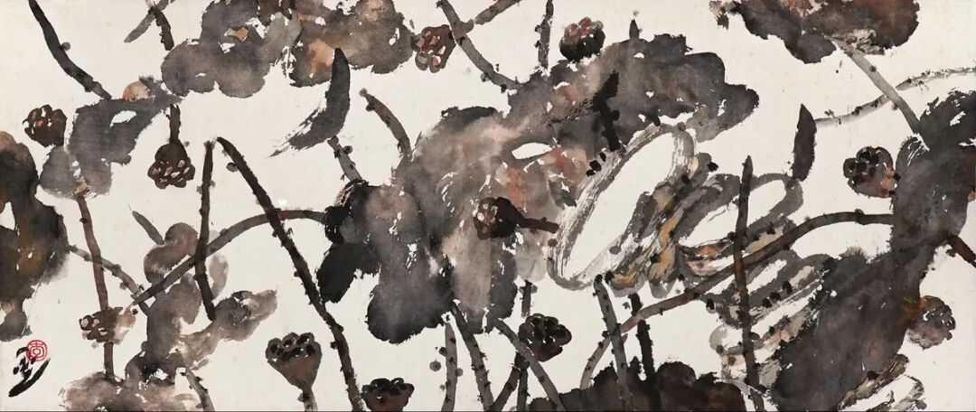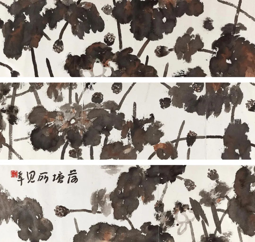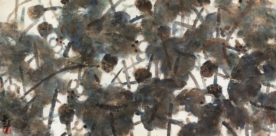 荷是传统绘画最为常见的题材。近现代的吴昌硕、齐白石、潘天寿、李苦禅、张大千、王雪涛、周思聪等等,都是画荷名家。他们提供了可资借鉴的种种画法与风格,但要不重复他们,进而超越他们,谈何容易!李老十的独特之处,首先在只画残荷。